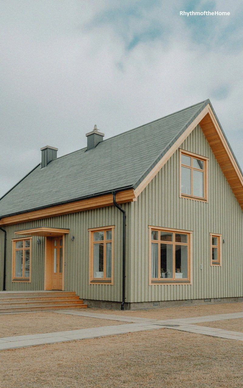 This inviting home features vertical siding painted in a soothing, earthy sage green. The roof is covered in textured grey slate tiles, complemented by warm, natural wood trim along the fascia and soffits. Large windows with light wood frames allow ample light to flood the interior and offer views of the outdoors. The entrance is marked by a simple flat roof overhang supported by brackets, sheltering a beautiful wooden door with glass panels. A wide wooden staircase leads up to the deck, connecting the home to the spacious gravel courtyard, evoking a sense of calm, rural elegance.