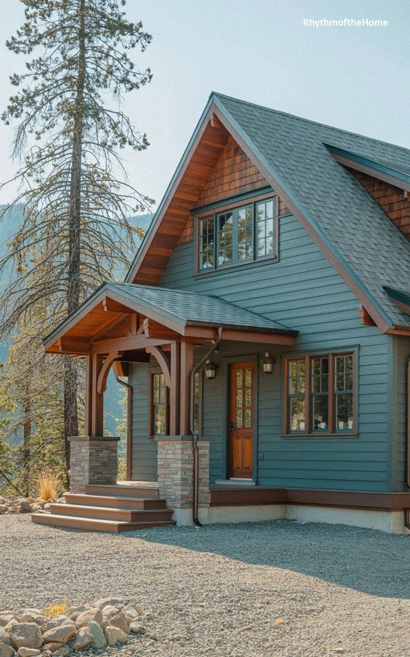 This striking home features deep blue-green horizontal siding, accented by a gable end clad in warm, reddish-brown cedar shakes. This color contrast highlights the architectural lines of the steep roof and the dormer window. The entry porch is framed by heavy timbers with curved knee braces, resting on stacked stone pillars. A dark metal roof covers the porch, while the main roof is shingled. The front door is warm wood, inviting guests inside. Situated on a gravel lot with a forest backdrop, this home perfectly balances cool and warm tones for a visually arresting exterior.
