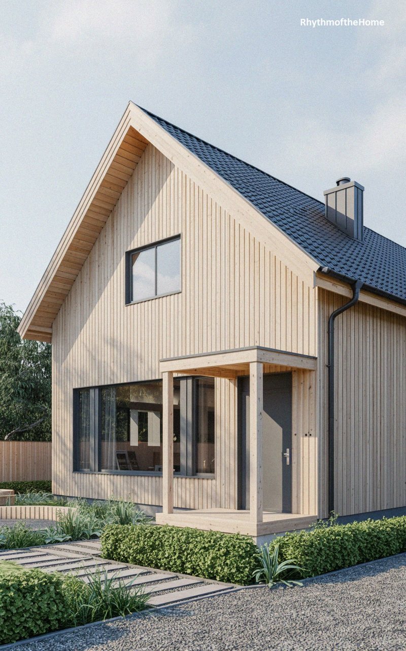 Embracing a minimalist Scandinavian aesthetic, this home features vertical wood siding left in a natural, light tone that emphasizes the grain and texture of the material. The steep, pitch-black roof creates a sharp, graphic contrast against the pale wood, while clean lines define the silhouette. A large picture window on the ground floor connects the interior living space directly with the outdoors, while a smaller upper window provides light to the loft. The entry porch is a simple, cubic wooden structure that frames a dark grey door. The landscaping is modern and structured, with concrete pavers, gravel, and low box hedges, reflecting a design philosophy that values simplicity, functionality, and a strong connection to nature.
