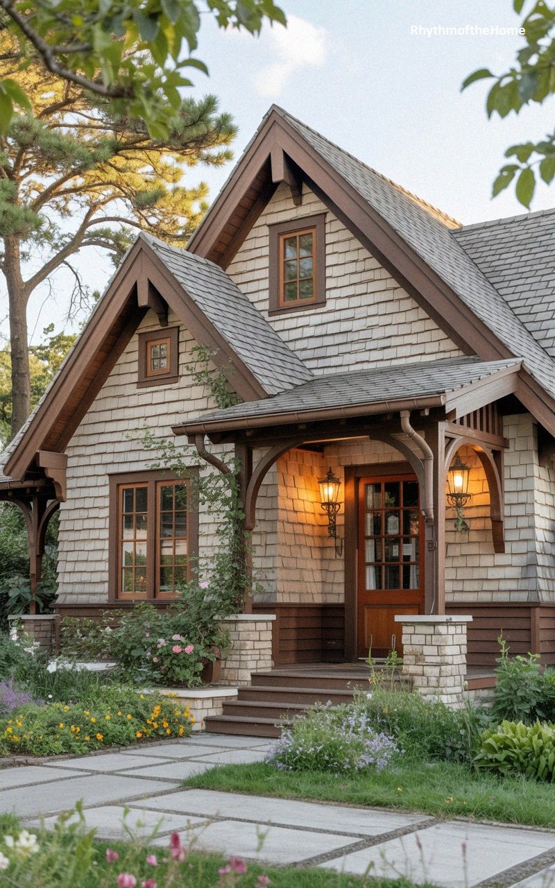 With its steeply pitched gables and swooping rooflines, this home looks as if it were plucked from a storybook. The exterior is clad in textured cedar shakes, weathered to a soft grey, with dark brown trim emphasizing the intricate roof angles. A charming, arched portico frames the entryway, supported by curved timber braces that add a touch of whimsy. Lantern-style lights cast a warm, inviting glow on the wooden front door. The landscaping is lush and cottage-like, with a mix of colorful wildflowers and creeping vines climbing the façade. A paved stone path with grass growing between the joints leads to the entrance, enhancing the romantic, old-world feel of this enchanting and unique residence.