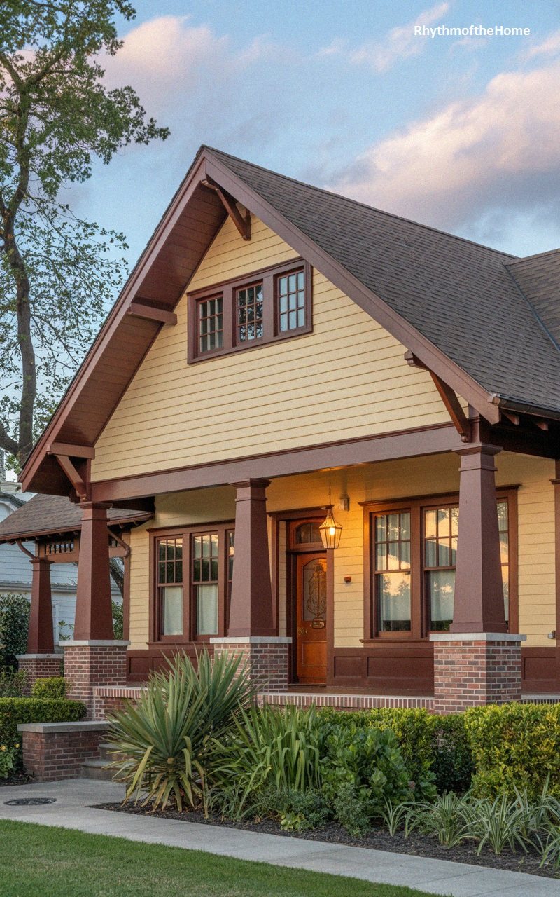 Cheerful and inviting, this home features soft yellow lap siding that pairs beautifully with the dark red brick of the porch foundation and columns. The roof is a steep gable with deep brown trim and fascia, grounding the lighter siding color. A dormer window with three sashes breaks up the roof plane, adding light to the upper story. The porch is substantial, with heavy tapered columns on brick piers, a classic bungalow trait. The front door is wood with an oval glass insert, flanked by sidelights. The garden is filled with spiky yucca plants and low green hedges, creating a textured green border that contrasts with the brick and siding, resulting in a home that feels sunny and solidly built.