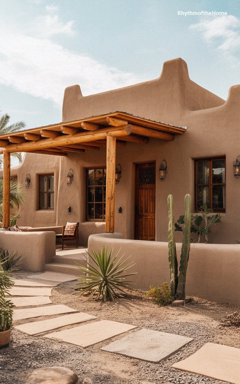 Capturing the essence of the Southwest, this Pueblo-style structure utilizes organic shapes and earthen materials to create a serene retreat. The exterior walls are finished in a smooth, tan stucco that mimics traditional adobe mud construction, featuring rounded edges and stepped parapets that silhouette beautifully against the pale sky. A rustic timber pergola extends from the façade, supported by raw wood columns that provide shade to the patio area below. The entryway is marked by a heavy, carved wooden door with iron detailing, flanked by wrought-iron lanterns that cast a warm glow. The landscaping is xeriscaped with minimalist gravel paths, sculptural cacti, and yucca plants, reinforcing the home’s connection to its arid environment while offering a cool, shaded sanctuary.