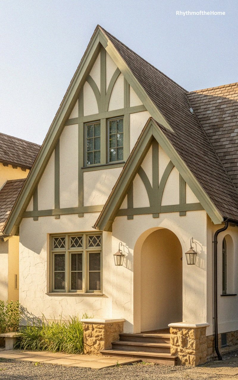 This home captures the essence of the Tudor Revival style with its steeply pitched, cross-gabled roof and decorative half-timbering. The exterior is finished in a creamy stucco, with dark brown timber beams creating geometric patterns in the gables. The front door is arched, mimicking the curve of the portico entrance, and is made of solid wood with iron strap hinges. Diamond-pane windows add a historic, medieval flair to the façade. To the left, a large window allows light into the living room. The entryway is highlighted by two lantern sconces. The yard is lush with green grass and stone pavers, leading to a home that feels like a cozy, historic English cottage transplanted to a suburban setting.