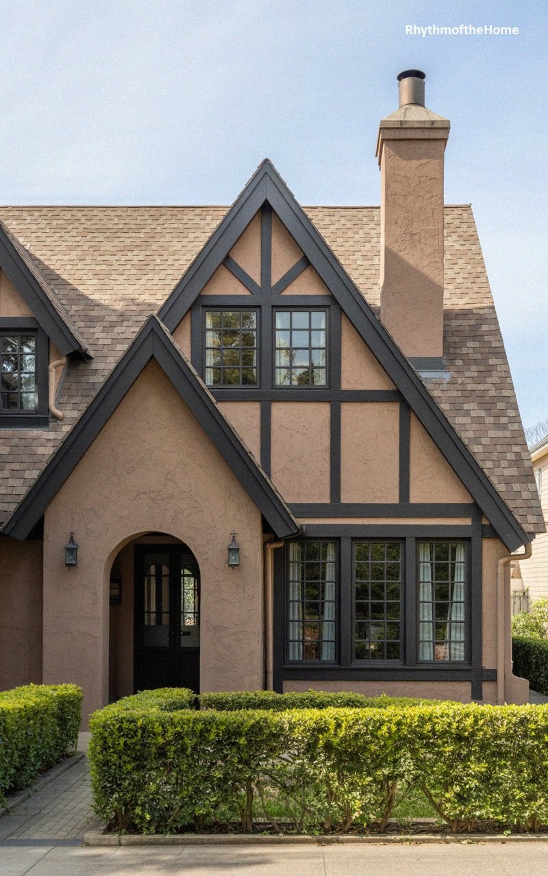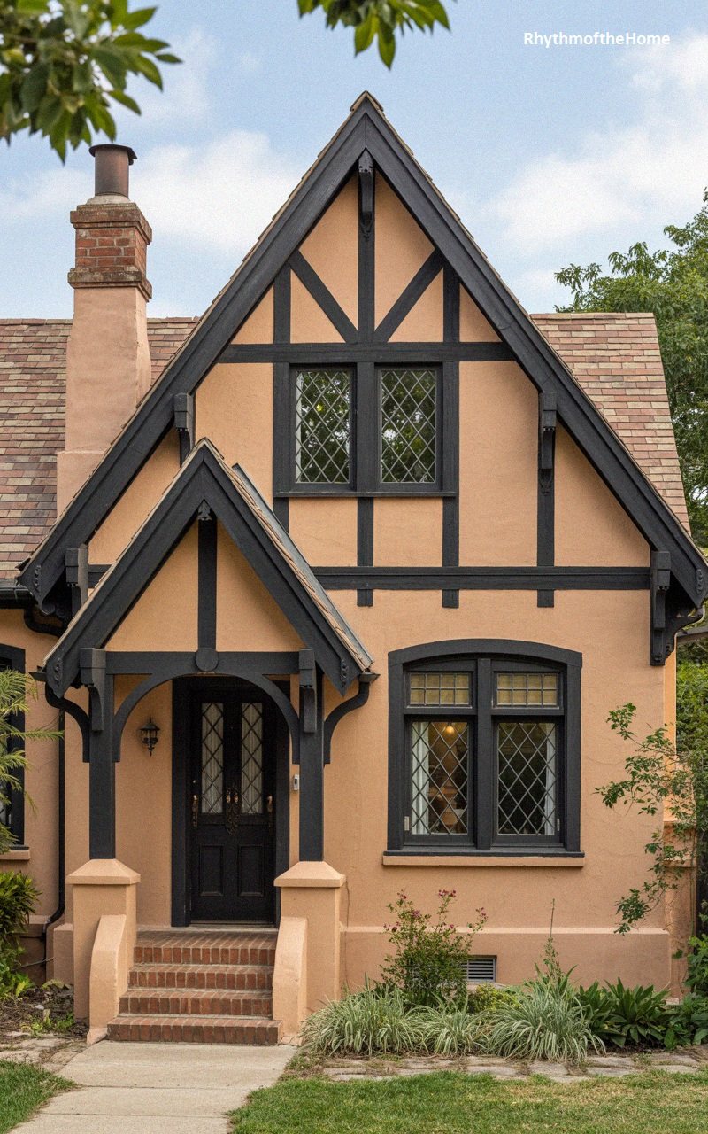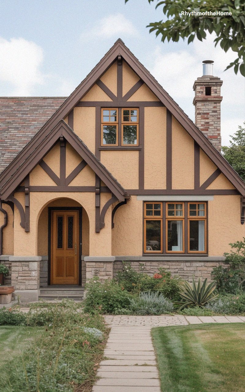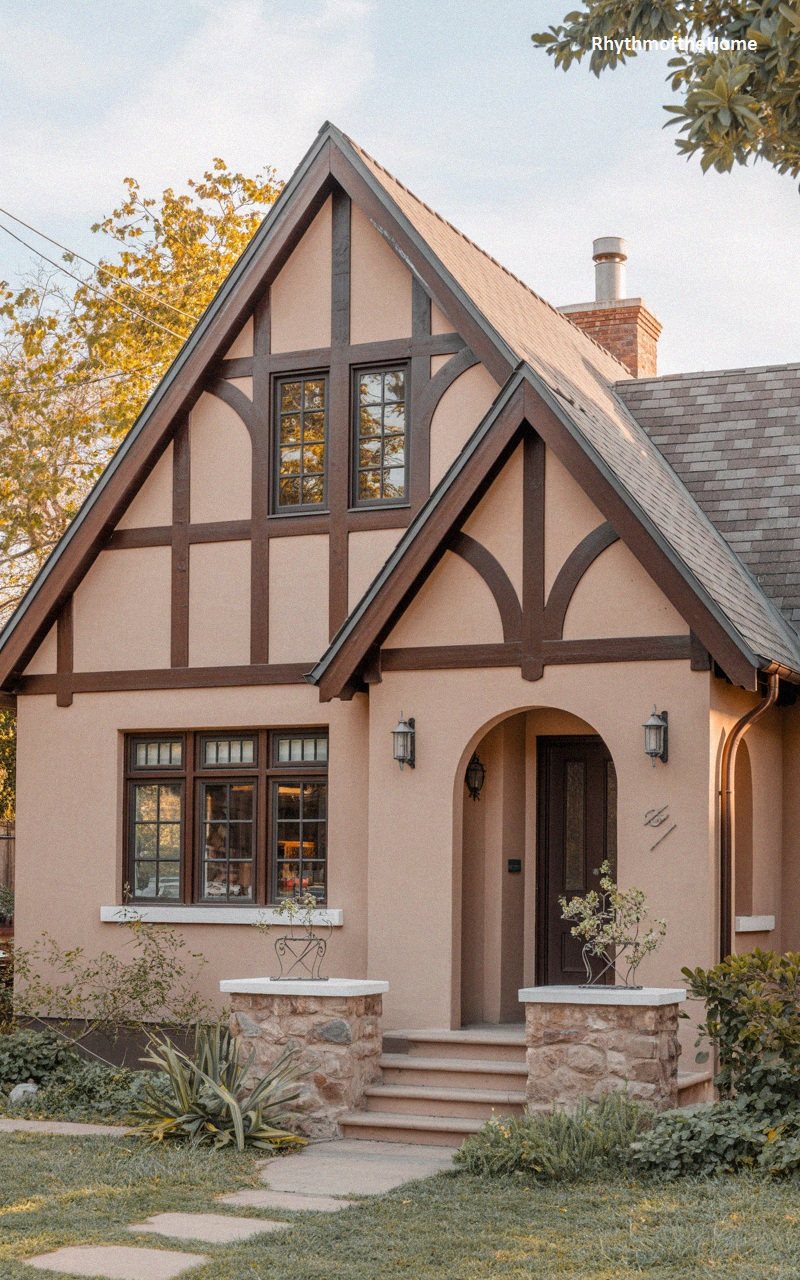 Warm and inviting, this Tudor home features peach-colored stucco walls with dark brown timber detailing. The steep roof is covered in brown shingles, creating a cohesive earth-tone palette. A small, gabled portico projects from the front, supported by timber posts, sheltering the arched entryway. The front door is black, providing a strong visual anchor. To the left, a triple window with dark frames lets light into the main living area. A stone planter box is integrated into the front of the house, filled with greenery. The walkway is made of irregular flagstones set in grass, leading to the steps, contributing to the home’s rustic, cottage-like charm.