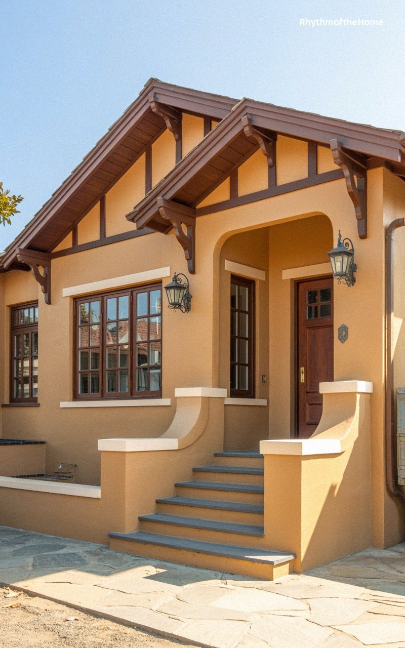 This home radiates warmth with its golden-orange stucco walls and brown timber detailing. The roofline features decorative rafter tails and a mix of gables. The entrance is recessed under an arched opening, adding depth and shadow to the façade. To the left, a large window with multiple panes is framed in dark wood, matching the decorative brackets supporting the eaves. Lantern-style lights are mounted on the walls, enhancing the Spanish aesthetic. The steps are grey stone, leading up to a tiered porch area. The landscaping is minimal, with stone paving and low maintenance ground cover, suited to a warm climate and allowing the vibrant color of the house to dominate.