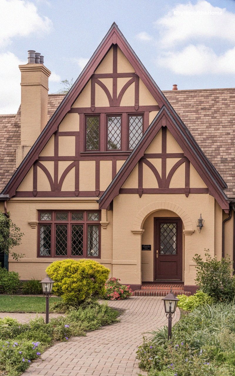 A masterclass in storybook charm, this residence blends Tudor Revival motifs with the cozy scale of a bungalow. Its steep, cross-gabled roofline is punctuated by rich burgundy half-timbering that pops against warm parchment-toned stucco. Diamond-paned windows offer a whimsical nod to medieval design, while an elegant arched entrance invites guests inside. The brick-paved path winds through a curated garden of golden-green shrubs and purple blossoms, leading to a front door that matches the deep, wine-red trim. It’s a home that feels like a lived-in fairytale, standing tall with a stately chimney and timeless architectural character.