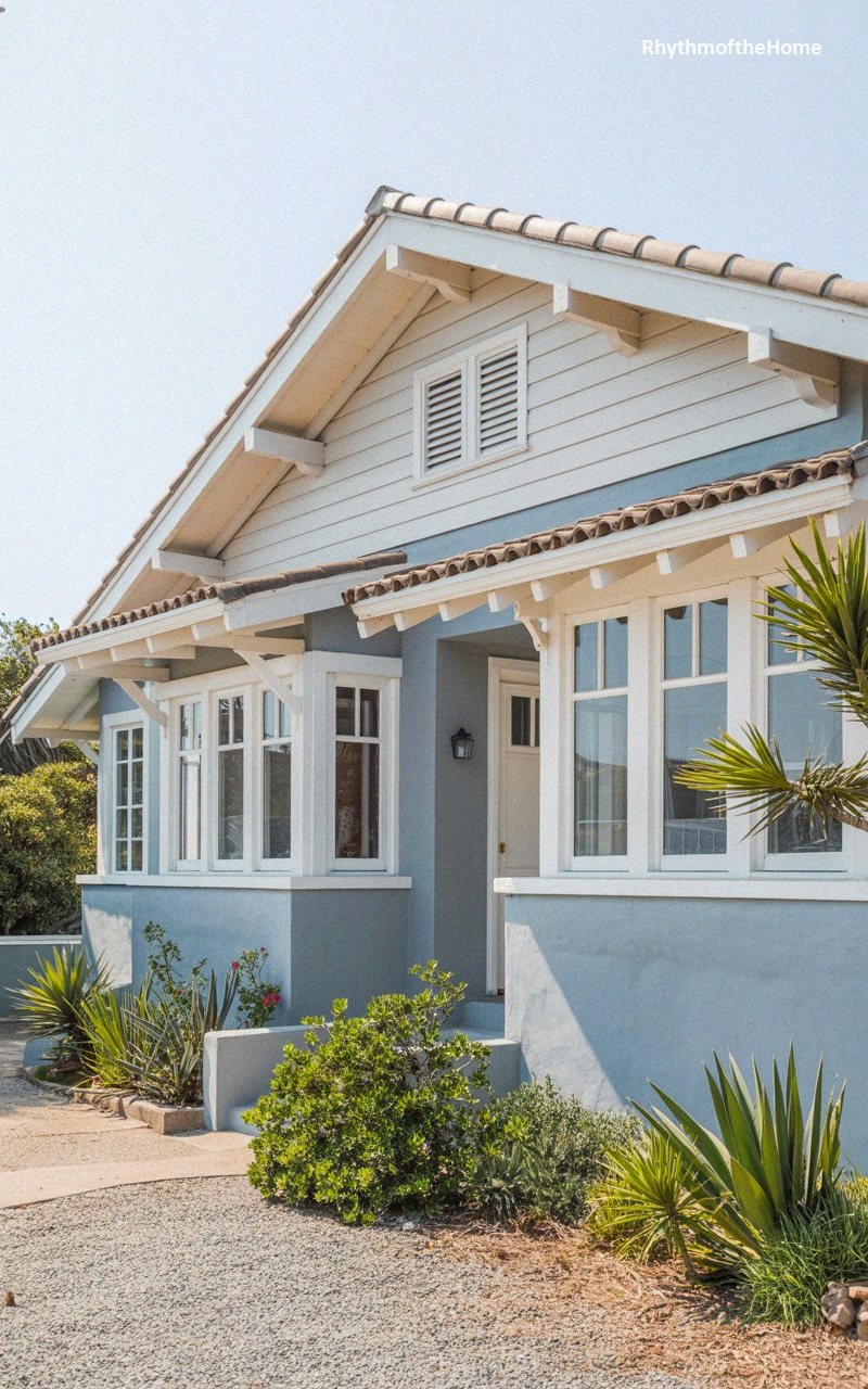 Radiating the freshness of a seaside escape, this bungalow is wrapped in serene cornflower blue siding and crisp white accents. The architectural depth is defined by prominent bracketed eaves and exposed rafters that support a textured tile roof. Wide windows invite the daylight into the interior, framed by chunky white trim that highlights the home’s sturdy proportions. At the front, spiky agave and desert-style flora sprout from a bed of pale gravel, lending a modern, low-maintenance edge to the classic silhouette. It is a sun-drenched sanctuary where traditional craftsmanship meets the relaxed, airy vibe of a California beach cottage.