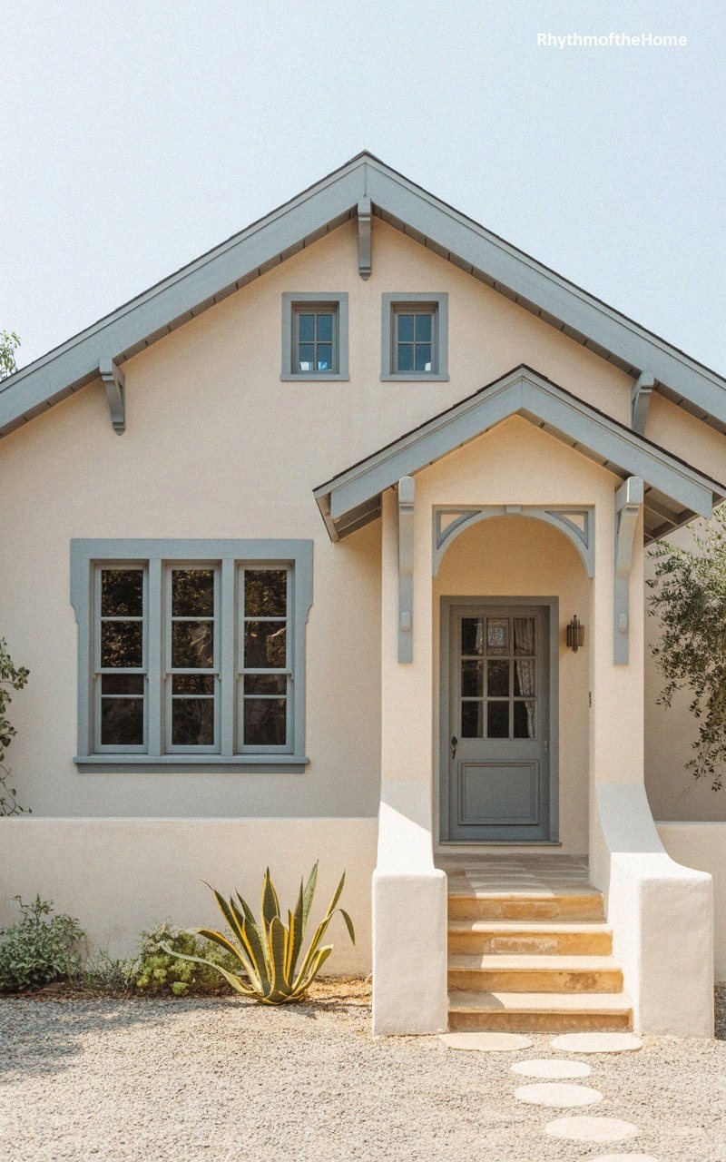 Stripped of excess but rich in style, this bungalow showcases a refined, minimalist take on traditional design. The smooth, cream-colored exterior is elegantly offset by trim in a soft, misty blue, highlighting the sharp peaks of the gables and the dainty arched porch bracket. Small, twin windows peek out from the attic level, adding a touch of symmetry to the facade. A clean concrete path leads past a solitary agave plant toward the centered front door, creating a look that is both intentional and tranquil. This home is a testament to the power of a limited color palette and flawless architectural proportions.
