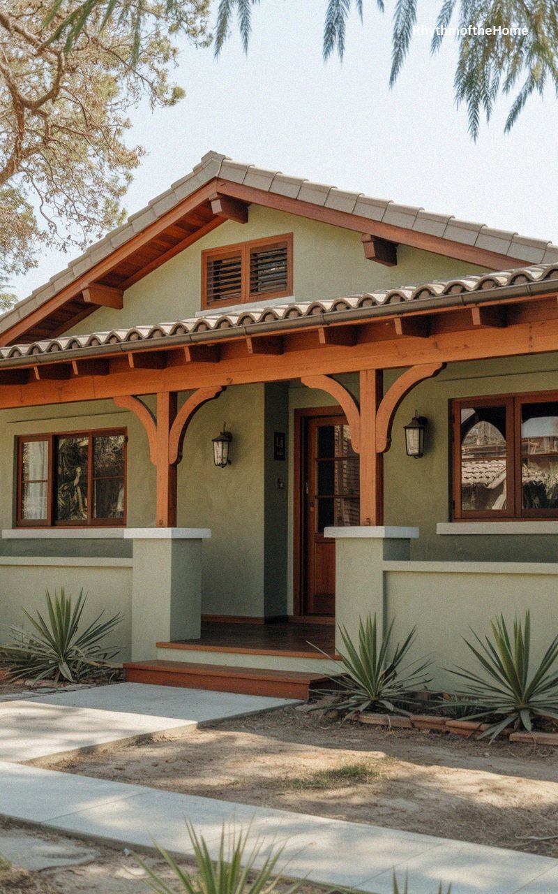 Nestled into its landscape, this bungalow uses a soothing sage green palette to harmonize with the surrounding nature. The standout feature is the exquisite natural wood timbering on the porch, where gracefully curved brackets support a deep, overhanging roof. This organic warmth is mirrored in the wooden window frames and the rich flooring of the veranda. Topped with classic clay tiles and surrounded by spiky desert plants, the home strikes a perfect balance between rustic charm and refined craftsmanship. It feels like a peaceful woodland retreat, where every architectural detail is designed to celebrate the textures of the natural world.