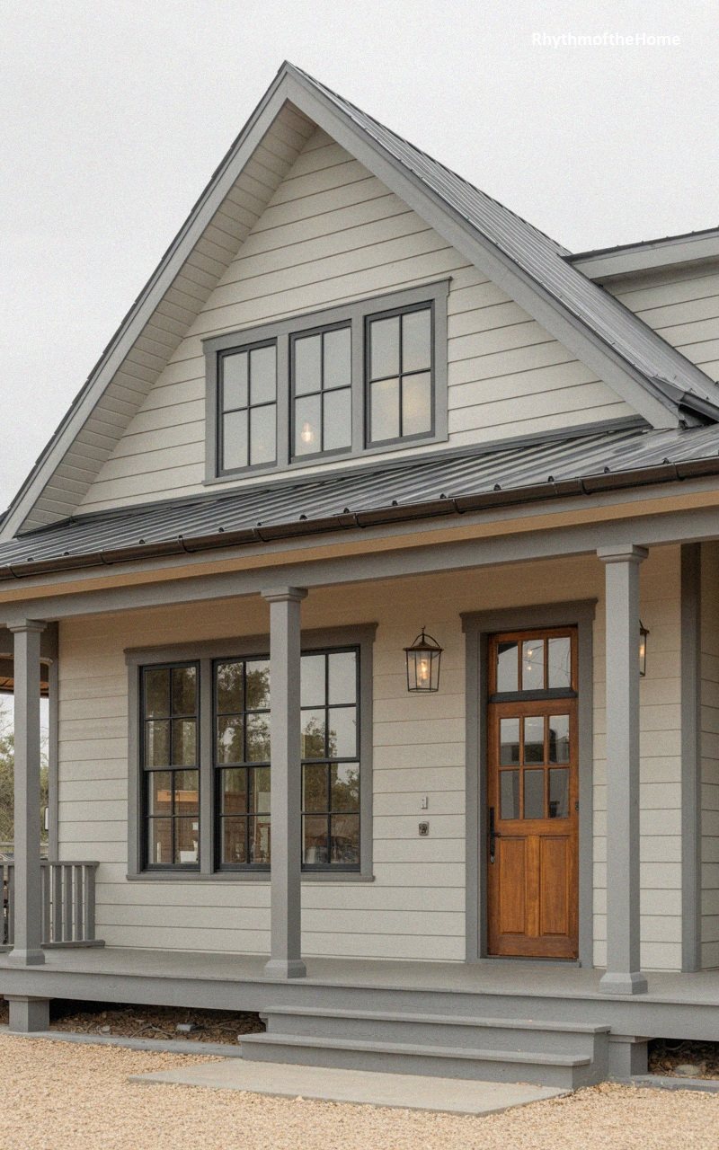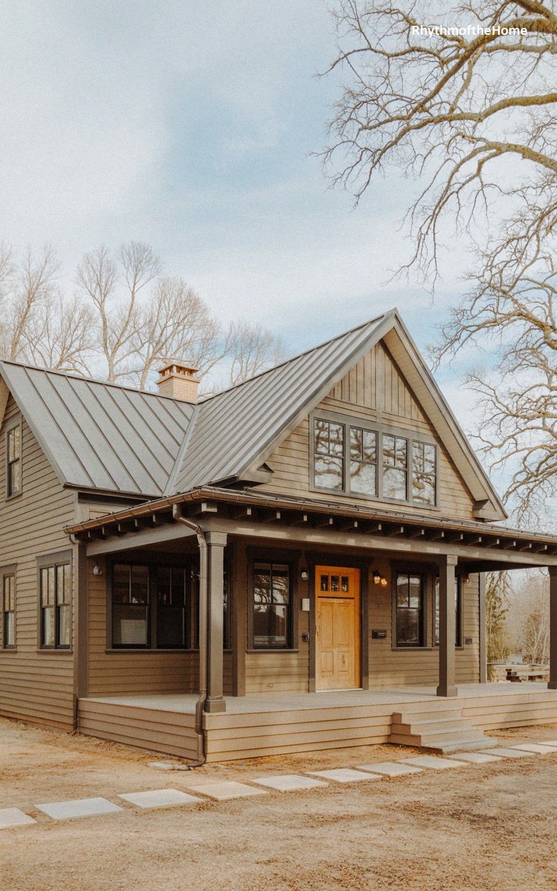 Blending the nostalgia of a country cottage with the sleekness of modern design, this home features horizontal grey siding and a sharp metallic roof. The broad front porch is supported by slender columns, creating an open and airy transition between the indoors and the gravel driveway. A warm, natural wood door serves as a focal point, its glass panes reflecting the soft glow of interior lighting. Large, dark-framed windows provide a contemporary touch, while the neutral color palette keeps the overall look sophisticated and understated. It is a functional yet stylish residence that prioritizes clean lines and high-quality materials.