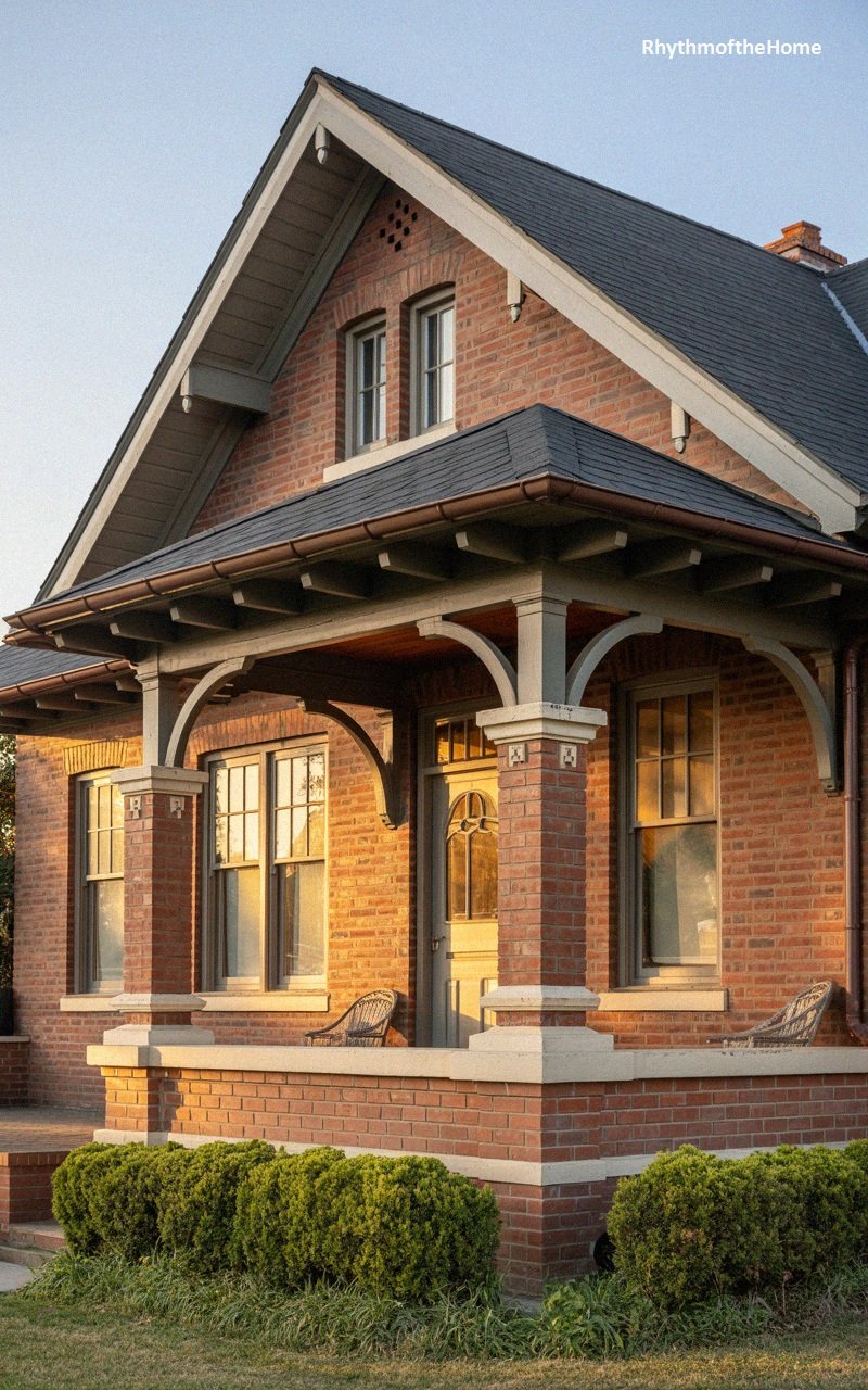 This striking residence utilizes red brick to create a sense of warmth and solidity, distinguishing it from its wooden counterparts. The gable roof, covered in dark slate tiles, features exposed rafter tails and decorative white braces that pop against the dark eaves. The porch is a standout feature, with brick columns that transition into creamy, painted wood arches, framing the entryway with elegant curves. The front door, bathed in the golden light of the setting sun, includes glass panels that reflect the outdoors. Large double-hung windows allow ample light to flood the interior, while wicker furniture on the porch suggests a slow, relaxed pace of life. The manicured boxwood hedges along the foundation add a touch of formal greenery to the welcoming exterior.