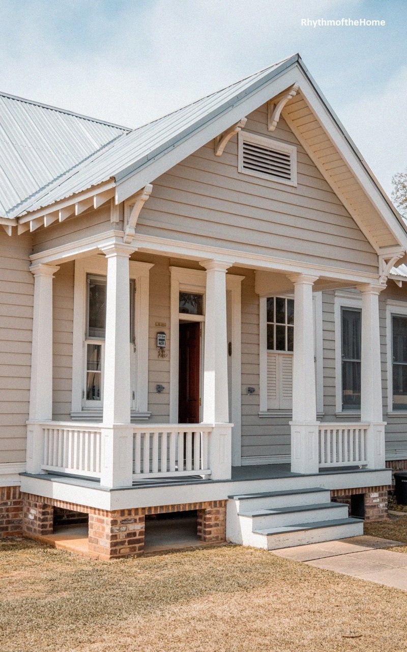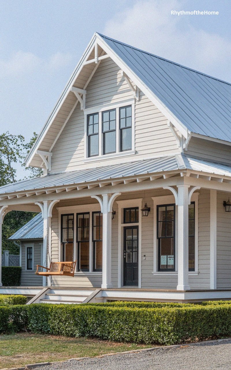 Standing with understated elegance, this cream-colored bungalow features a soaring gable and a wrap-around porch that epitomizes suburban comfort. The light-toned siding is paired with a cool-toned metal roof, while dark window sashes provide a crisp, graphic punch to the facade. A traditional wooden porch swing hangs invitingly, suggesting a slow-paced lifestyle and quiet afternoons spent outdoors. Decorative brackets under the eaves add a layer of historical detail, and a low, meticulously trimmed hedge borders the lawn. This home feels balanced and serene, offering a perfect blend of traditional architectural silhouettes and a clean, refreshing modern color story.