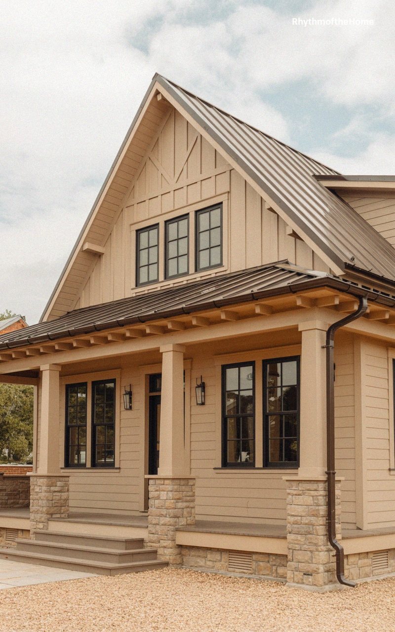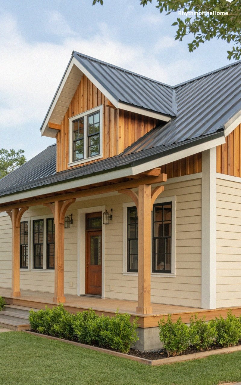 This charming residence perfectly balances rustic warmth with modern definition. The exterior features smooth, cream-colored horizontal siding that provides a neutral backdrop for the striking architectural details. A prominent front gable is clad in natural, vertically oriented cedar planks, adding a rich, organic texture that contrasts beautifully with the sleek, dark metal roof. Black window frames sharpen the facade, offering a contemporary edge, while the welcoming front porch is supported by sturdy timber posts with angled knee braces. Lush green boxwoods line the base of the porch, grounding the home in nature and enhancing its curb appeal.