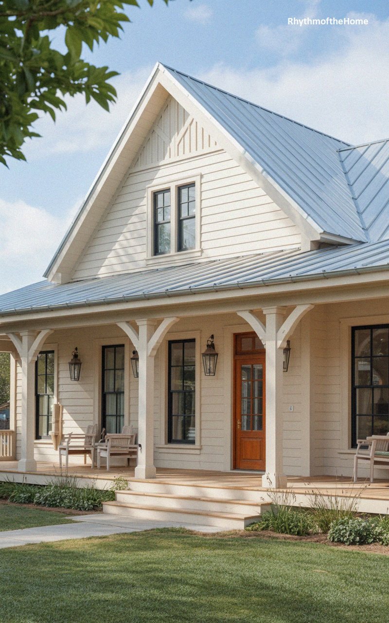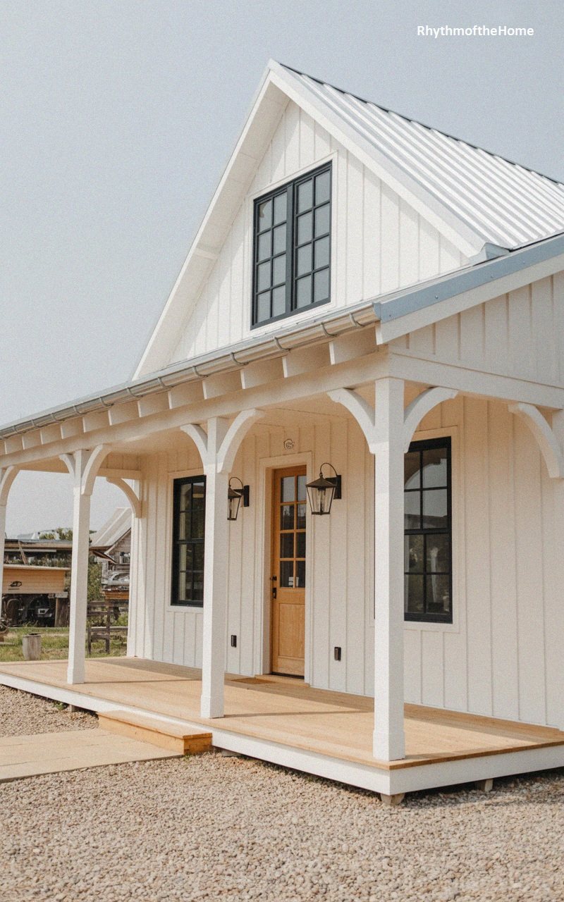Embodying the clean and airy aesthetic of the modern farmhouse style, this structure is clad entirely in crisp white board-and-batten siding. The monochromatic palette is punctuated by stark black window frames and a matching black front door, creating a sophisticated high-contrast look. A silver metal roof reflects the sunlight, adding an industrial touch to the rural-inspired design. The expansive front porch features a warm, natural wood deck and is framed by white columns adorned with elegantly curved brackets. A gravel foreground suggests a relaxed, countryside setting, making the home feel approachable yet distinctly stylish.