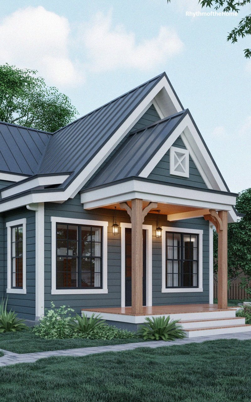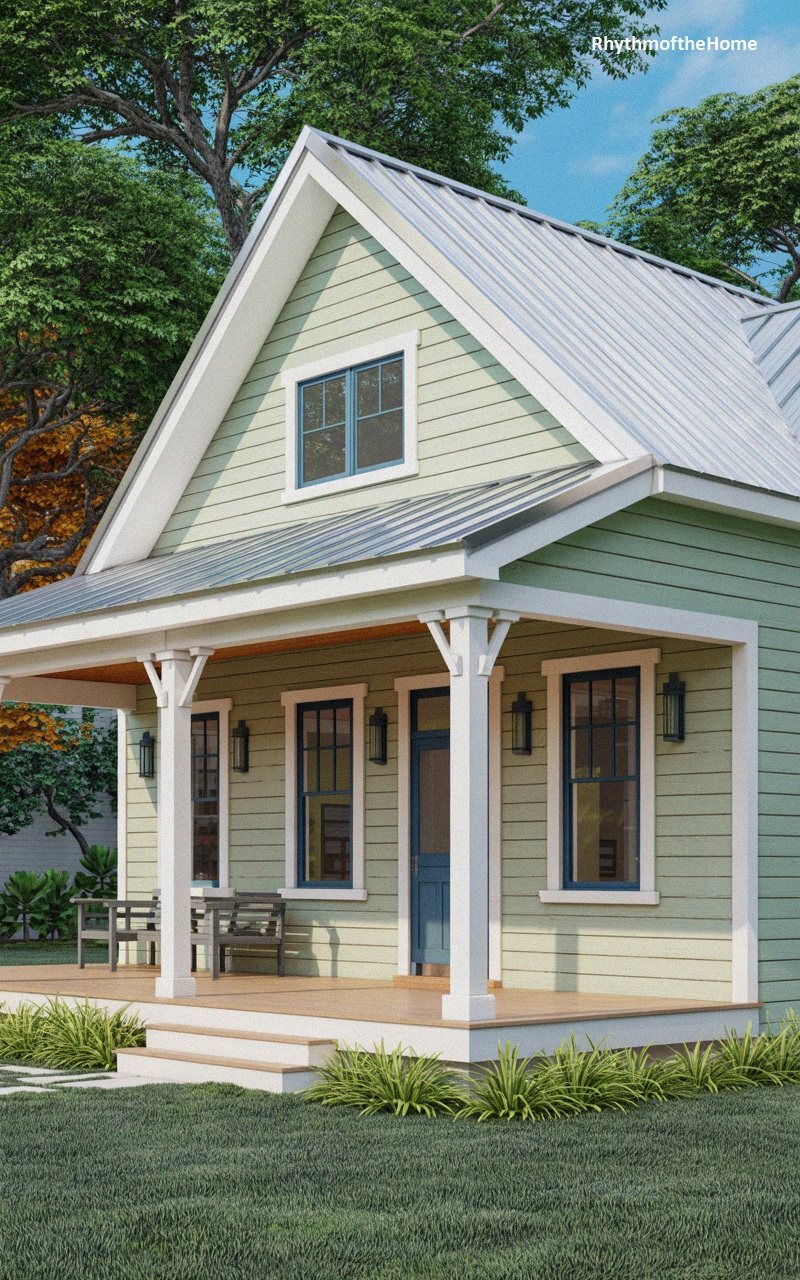 Radiating a sense of calm and tranquility, this cottage is painted a soft sage green that harmonizes beautifully with the surrounding greenery. The horizontal siding is trimmed in crisp white, highlighting the architectural lines of the gables and windows. A grey metal roof offers durability and a sleek texture. The entry porch is supported by white posts with decorative craftsman-style brackets, protecting a wooden deck and a charming blue front door with glass panels. Low-maintenance landscaping with ornamental grasses borders the home, enhancing its organic, peaceful, and inviting curb appeal.
