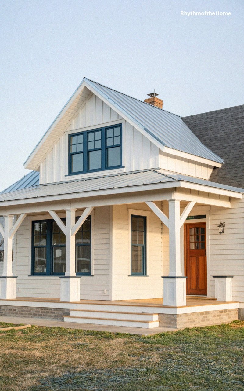 Fresh and traditional, this home features bright white vertical board-and-batten siding that creates a sense of height and cleanliness. The roof is a mix of grey shingles and metal sheeting on the porch, adding texture to the silhouette. A standout feature is the use of deep navy blue for the window frames, which adds a nautical or coastal elegance to the white facade. The porch columns are sturdy and white, resting on grey stone pedestal bases that provide a solid visual foundation. A warm wooden floor on the porch and stone skirting complete this timeless, well-crafted exterior.