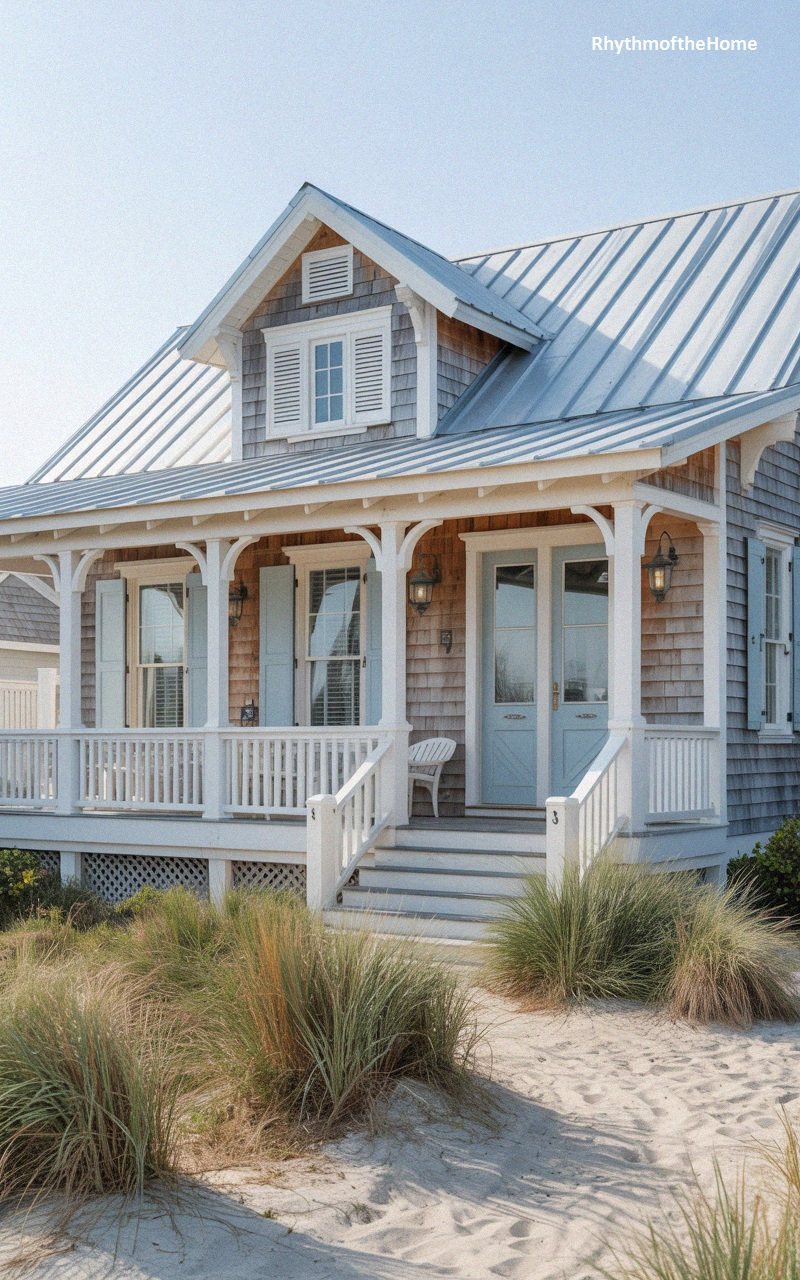Evoking the breezy atmosphere of a seaside retreat, this charming cottage features weathered grey shake siding and a crisp, metal roof that reflects the bright coastal light. The architecture is characterized by a central dormer window with white shutters, adding a touch of symmetry to the roofline. Below, a wide, covered veranda stretches across the front, supported by slender white columns with subtle decorative brackets. The porch floor is elevated, with wide steps leading up to double French doors painted a soft, welcoming blue. The landscaping is wild and natural, with dune grasses and sandy soil replacing a traditional lawn, firmly rooting the home in its beachside context. It is a design that prioritizes outdoor living and a connection to the ocean air.
