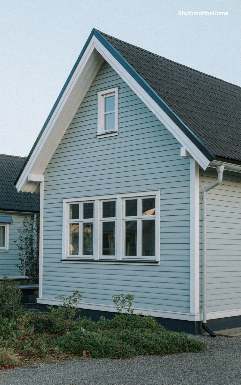 Radiating a classic and cheerful charm, this home features soft, powder-blue horizontal siding that pairs beautifully with crisp white trim. The steep gable roof, covered in dark grey tiles, adds a sense of height and traditional character. A small, square window sits high in the gable, drawing the eye upward, while a larger, three-pane window on the main level ensures the interior is bright and airy. The white corner boards and window casings define the structure’s geometry against the pastel blue. Surrounded by low-lying green shrubs, this residence feels cozy, established, and welcoming.