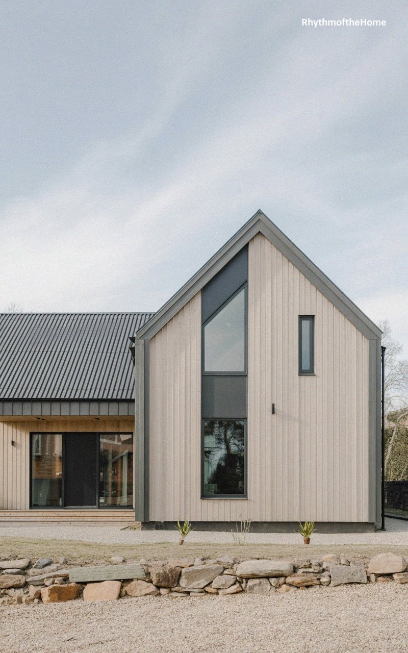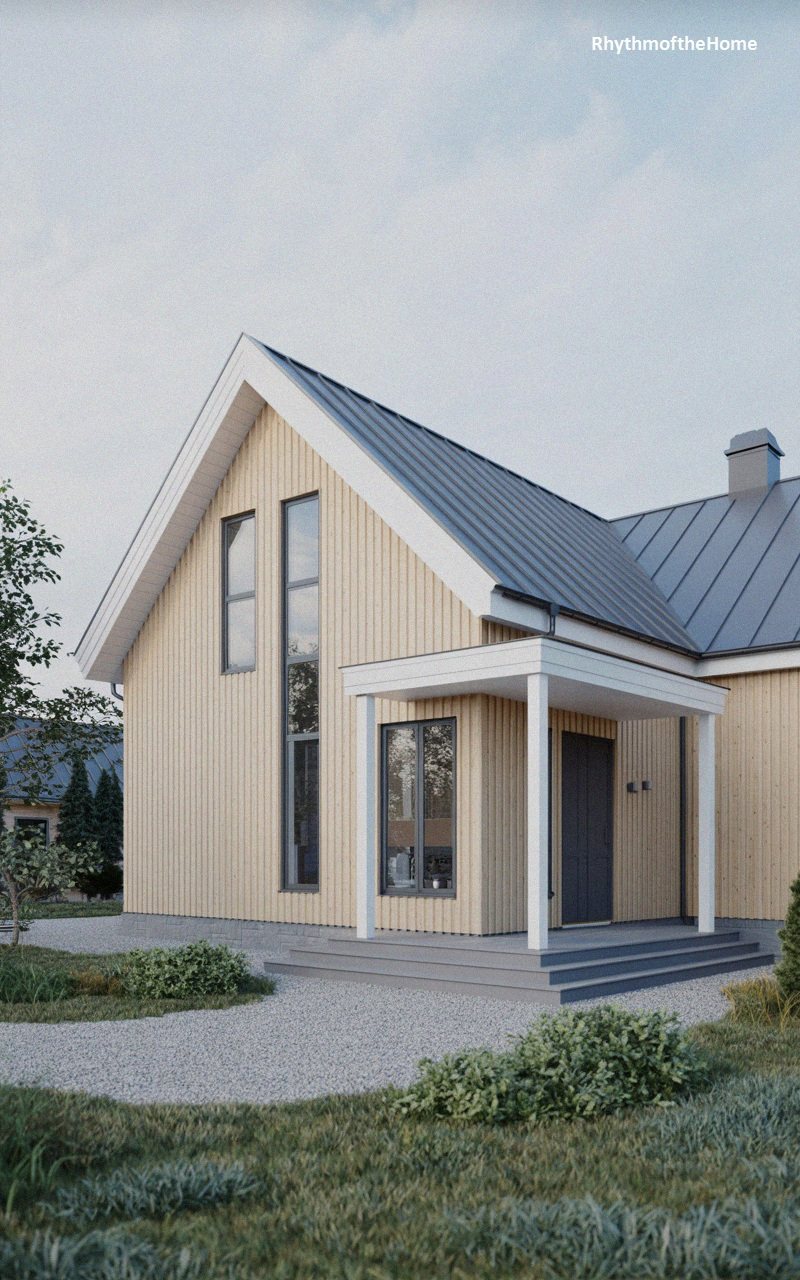 This residence showcases a fresh take on modern living with its pale, natural vertical wood siding that gives it a light and airy appearance. The steep gable roof is clad in dark grey standing seam metal, providing a striking contrast to the blonde wood. A distinctive feature is the tall, narrow vertical window that spans two stories, adding a dramatic architectural element. A neat, white-framed porch with simple square columns protects the dark front door, creating an inviting entry point. A gravel driveway and manicured green lawn complete the clean, minimalist aesthetic of this stylish home.