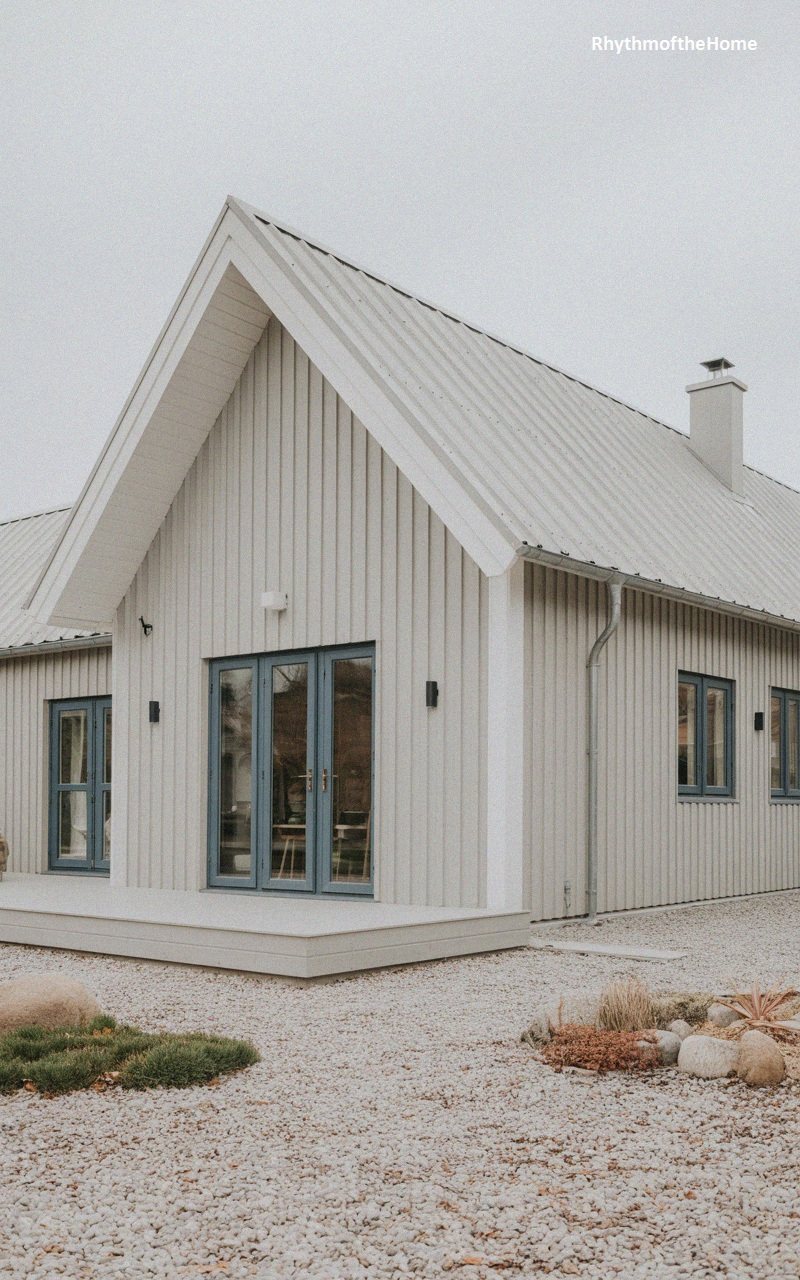 Merging the rustic appeal of a barn with modern refinement, this home is clad in crisp white vertical board-and-batten siding. The steep gable roof features light grey metal sheeting, keeping the palette neutral and sophisticated. Symmetrical French doors with dark frames serve as a focal point, opening onto a low-profile light grey wooden deck that extends the living space outdoors. Small, modern wall sconces flank the doors, providing subtle illumination. The surrounding landscape is composed of loose white gravel and scattered rocks with patches of low greenery, creating a serene, Zen-like atmosphere around the structure.
