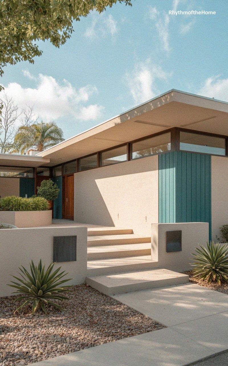 This architectural gem captures the essence of Mid-Century Modern design. The low-profile flat roof features deep overhangs that cast dramatic shadows. The exterior walls are finished in smooth beige stucco, contrasted by a striking teal-blue vertical siding accent panel that adds a pop of retro color. A row of clerestory windows runs just below the roofline, bringing in high light while maintaining privacy. A clean, concrete stepped path leads through a gravel garden dotted with sculptural agave plants, guiding visitors toward the recessed wooden entry door. The geometric low walls emphasize the horizontal lines typical of this iconic style.