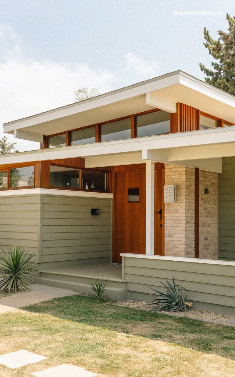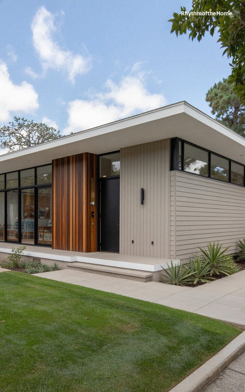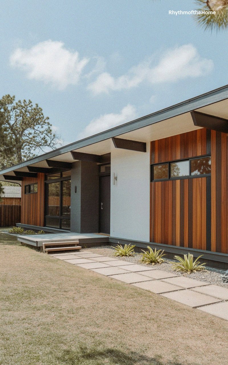 This home is a beautiful blend of materials and textures. One section of the facade features vertical wood siding in varying tones of rich brown and cedar, creating a dynamic, striped effect. This is balanced by a stark white stucco wall section that adds brightness and modernity. The flat roof extends with exposed dark beams, providing deep eaves that shade the large black-framed windows. A low concrete porch deck and a pathway of large square pavers lead through a minimalist garden with small green plants, culminating in a sleek, sophisticated entrance that celebrates mid-century design principles.