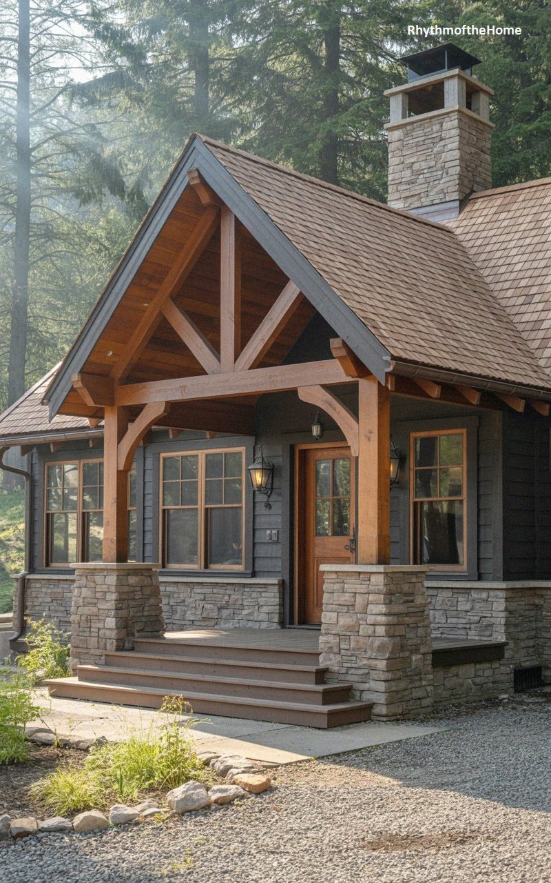 Designed to harmonize with a rugged forest setting, this lodge-style home features a robust combination of natural stone and heavy timber. The steep, shingled roof is punctuated by a massive stone chimney, hinting at a large hearth within. The entrance is framed by a dramatic timber-truss portico, where thick wooden beams form a truss pattern against the dark, moody siding. The porch rests on a foundation of stacked stone, with steps leading up to a rich, stained wood front door. Lantern-style lighting fixtures flank the entry, providing a warm, inviting beacon. The gravel driveway and native landscaping, including ferns and rocks, enhance the feeling of a secluded mountain hideaway perfect for escaping the bustle of city life.