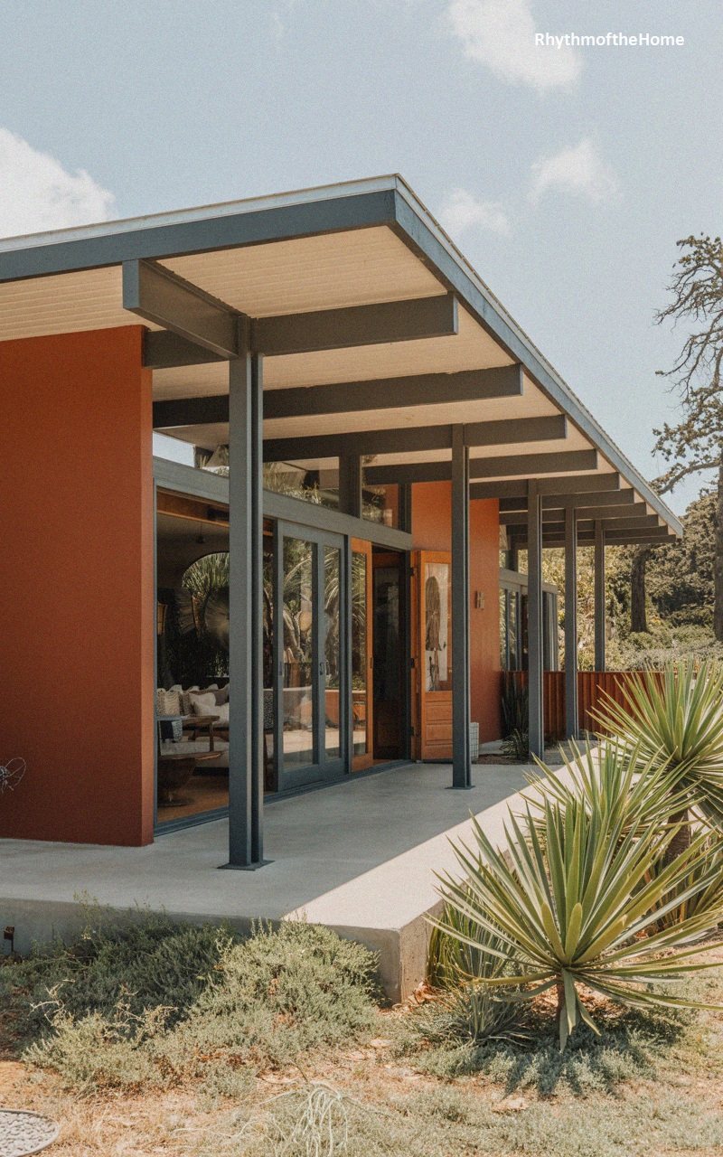 Bold and open, this mid-century inspired home features a striking burnt orange exterior that contrasts vividly with the grey steel beams supporting the roof overhang. The flat roof extends far out, creating a shaded veranda that runs the length of the house. Floor-to-ceiling glass sliding doors dissolve the barrier between the interior living space and the smooth concrete patio, promoting an indoor-outdoor lifestyle. Large agave plants in the foreground add sculptural greenery that complements the warm wall color. The exposed rafters and clean lines emphasize a structural honesty and a relaxed, modernist vibe.