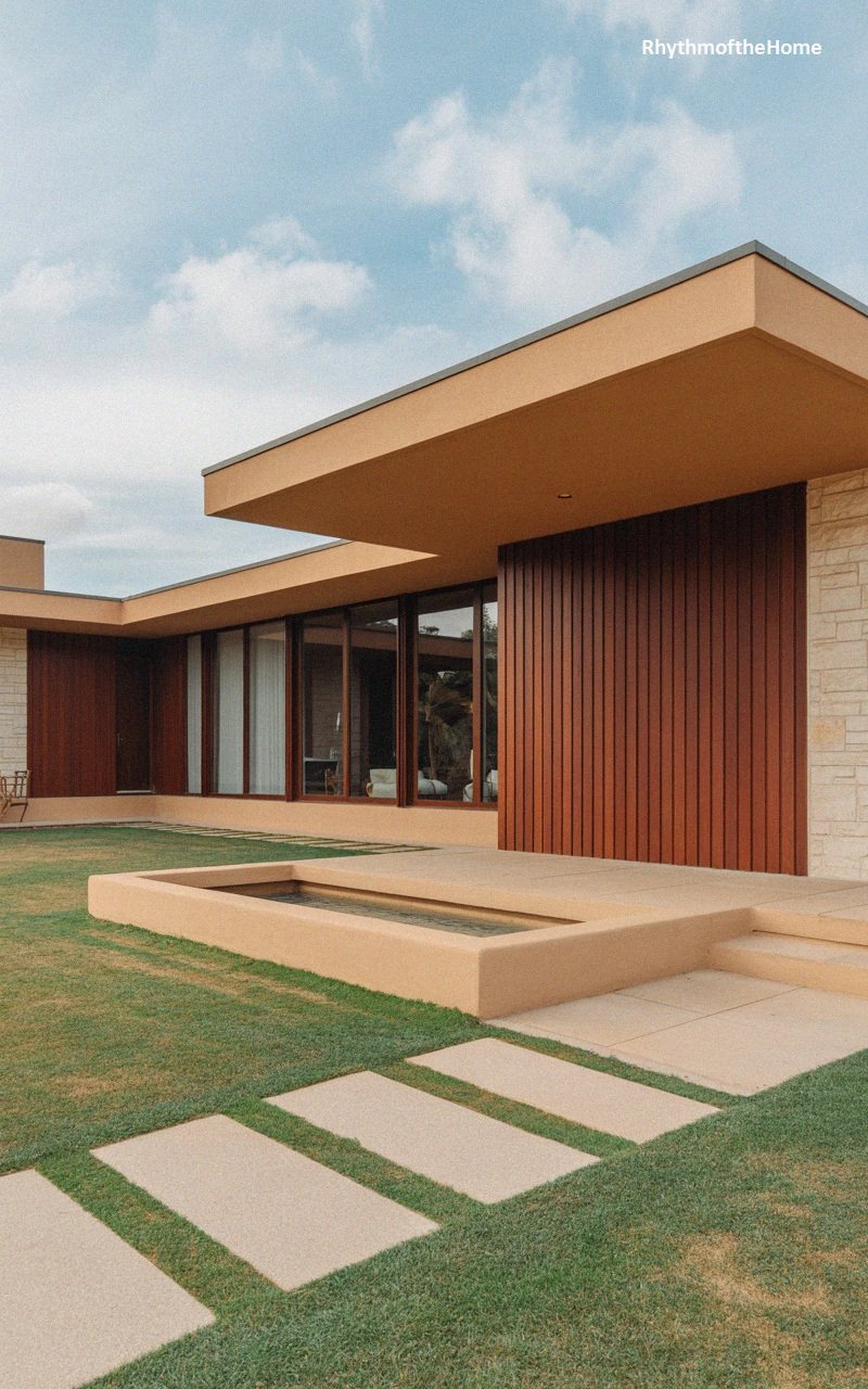 This luxurious contemporary home is defined by its strong horizontal lines and desert-inspired palette. The smooth stucco walls are painted a warm terracotta, while a section of vertical slat siding adds texture in a deeper red-brown hue. A massive flat roof cantilevers dramatically over the patio, providing ample shade. To the right, a wall of textured cream stone adds contrast. A minimalist rectangular water feature sits centrally in the foreground, bordered by clean concrete pavers and manicured grass. Large glass windows reflect the surroundings, creating a serene and sophisticated architectural statement.