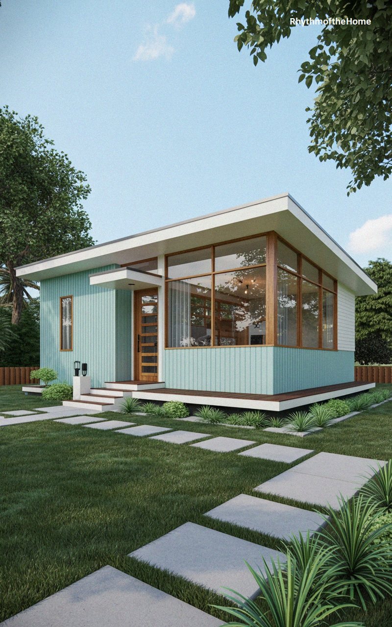 Playful and bright, this home embraces a retro aesthetic with its vibrant teal vertical siding. The design is dominated by expansive corner windows with warm wood frames that wrap around the living space, flooding it with natural light and offering panoramic views. A white flat roof with a slight pitch caps the structure, extending over the entrance to form a small cover. The white upper siding contrasts with the teal below. A dark wood deck elevates the home slightly above the lush green lawn, while a pathway of square concrete pavers invites guests toward the stylish wood and glass front door.