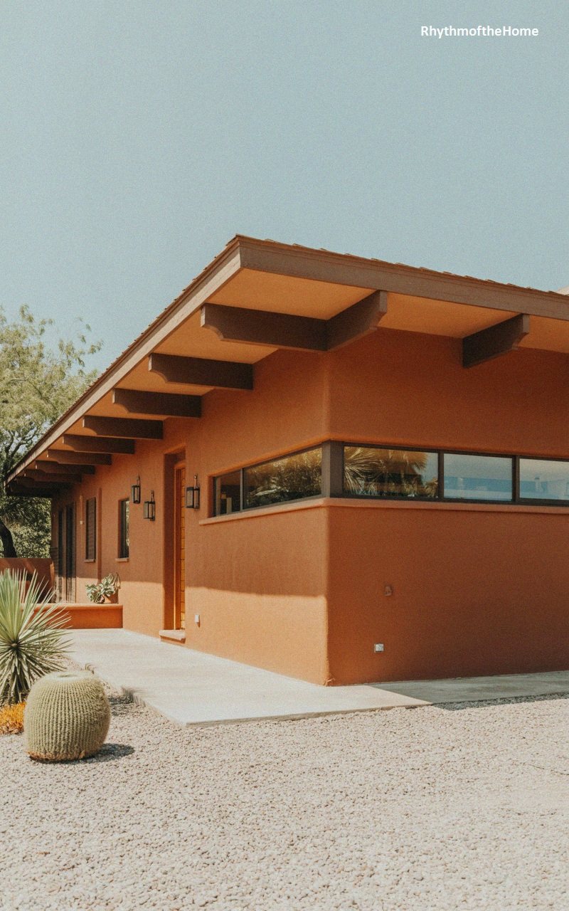 Inspired by Southwestern architecture, this home features rich orange stucco walls that glow in the sun. The low-profile flat roof is accentuated by dark brown exposed rafter tails that add a rhythmic visual detail. A modern corner window wraps around the building, breaking up the solid mass of the wall. The landscaping is xeriscaped with gravel and a large, round barrel cactus, reinforcing the desert aesthetic. A simple concrete walkway leads past the window toward a recessed entry area, creating a private and sheltered approach to this warm, earthy residence.