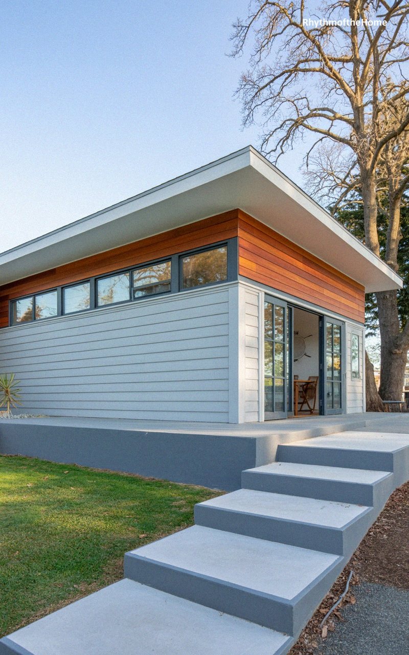 This compact and modern structure, likely a backyard studio or guest house, features clean grey horizontal siding. A band of warm, reddish-brown wood siding runs along the top just under the flat white roof overhang, adding a touch of natural warmth. A row of clerestory windows allows light to enter high up, maintaining privacy. Below, large glass French doors open wide onto a grey painted concrete patio, seamlessly connecting the interior to the outdoors. Concrete steps lead down to a grassy lawn, making this a functional and stylish auxiliary living space.