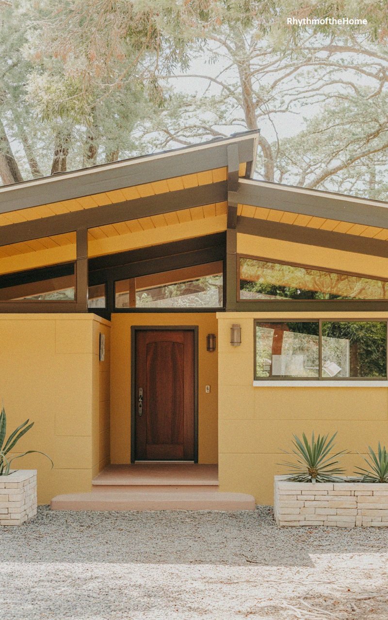 Vibrant and full of character, this mid-century home sports cheerful mustard yellow stucco walls. The roof is a low-pitched gable with deep eaves, supported by dark brown exposed beams that create a strong structural rhythm. A band of triangular transom windows follows the roofline, adding architectural interest and light. The dark wood front door is centered and recessed, offering a sense of arrival. In the foreground, white brick planter boxes filled with spiky succulents frame the gravel driveway, completing the retro, sun-soaked look of this distinctive property.
