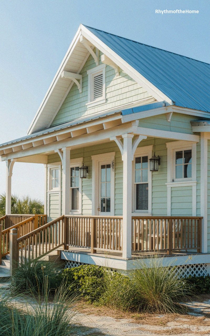 Fresh and breezy, this coastal home is clad in horizontal siding painted a cool mint green. The roof is covered in a light grey metal that reflects the sun, durable for seaside weather. A broad front porch spans the width of the house, supported by white columns with decorative curved brackets that add a craftsman flair. The porch railing is natural wood, providing a warm contrast to the pastel walls. A central door with glass panels is flanked by windows with white trim and black sconces. Lush green bushes and ornamental grasses line the base, grounding the home.