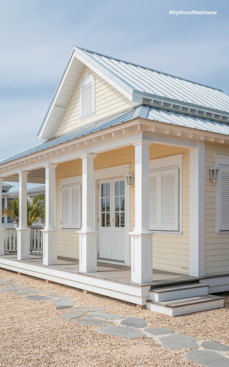 Radiating warmth, this home features sunny yellow horizontal siding that pairs classically with bright white trim. The metal roof is a soft silver-grey, featuring a small dormer vent. A deep, inviting verandah wraps around the front, supported by a series of square white columns on pedestal bases. The windows and double front doors are fitted with white louvered shutters, evoking a plantation or tropical colonial style. A wooden floor on the porch and stone pavers leading up to the steps add texture. The overall effect is one of traditional elegance and relaxed, warm-weather living.