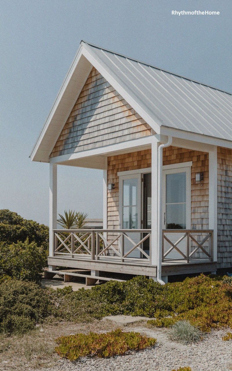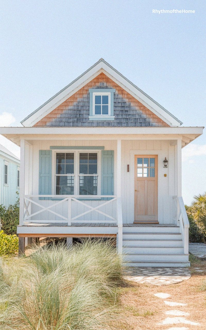 This adorable tiny home captures the essence of coastal charm. The main body is clad in white vertical board-and-batten siding, while the gable peak features natural cedar shakes that add rustic texture. A small, square window high in the gable adds interest. The front porch is compact, with a white railing and simple columns, protecting a light wood door with glass panes. Large windows with soft blue shutters flank the door. Raised on stilts, the home sits above sandy dunes filled with beach grass, and a stone path leads to the white wooden stairs.