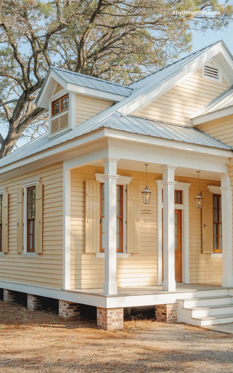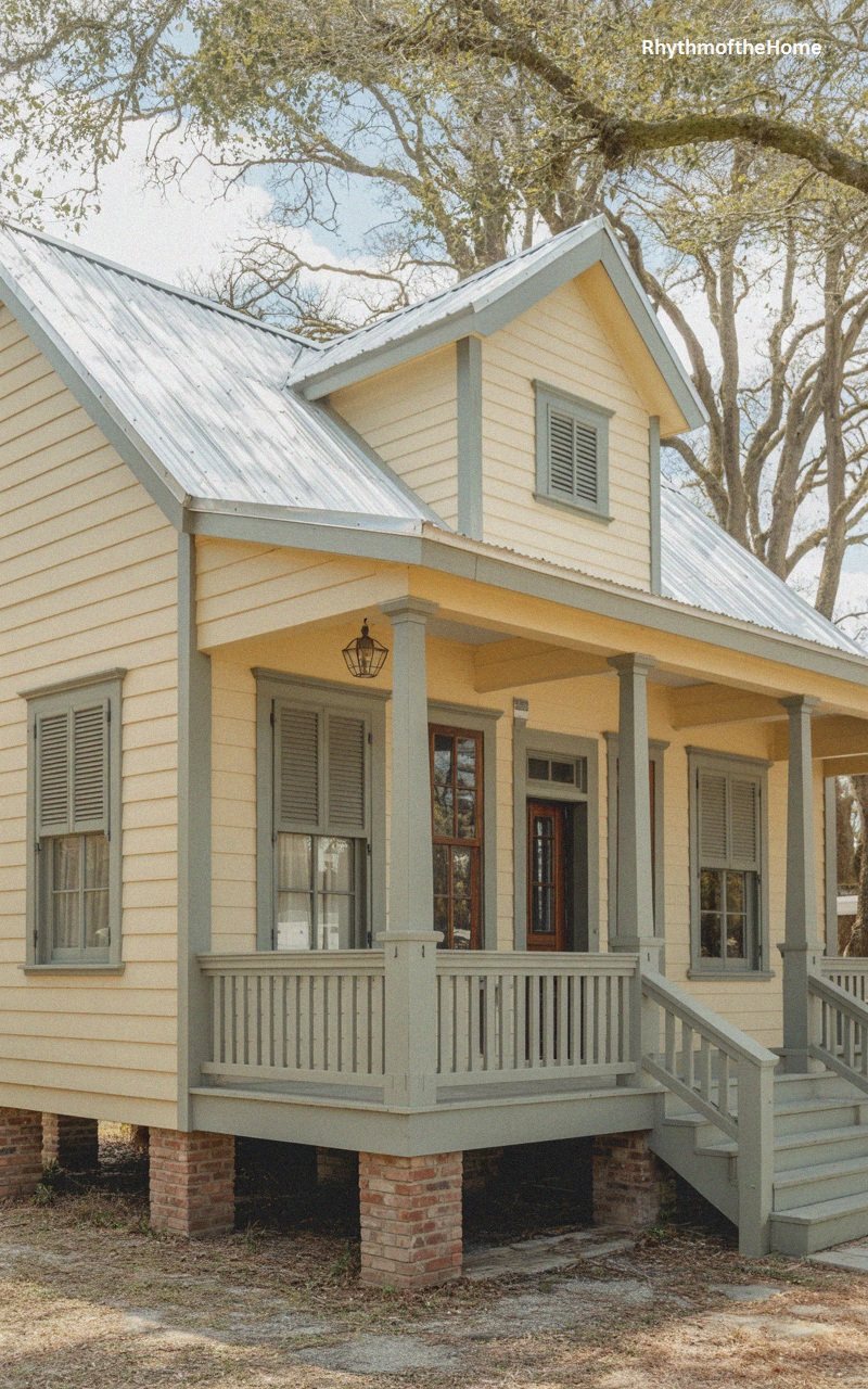 This delightful cottage sits elevated on sturdy brick piers, a practical design for its likely coastal or low-country setting. The exterior is clad in cheerful, pale yellow horizontal siding that pairs elegantly with soft grey trim around the windows and porch structure. A durable silver metal roof reflects the sunlight, adding a touch of industrial resilience to the charming facade. The front porch features a simple, slat-style railing and is supported by square columns, creating a shaded haven. Louvered shutters flank the tall windows, enhancing the traditional aesthetic, while the open space beneath the house ensures airflow and historical authenticity.