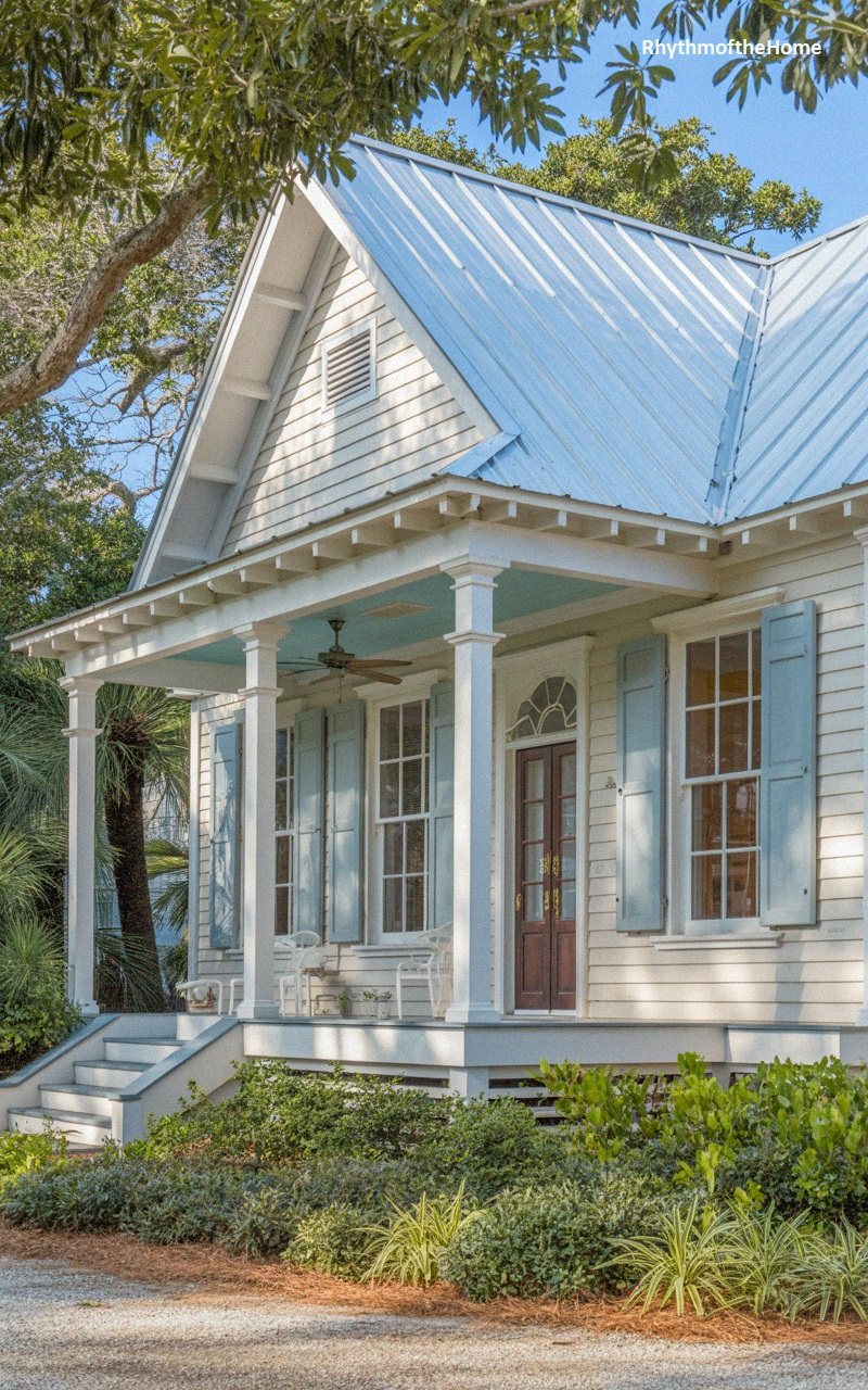 Exuding Southern charm, this white weatherboard residence features a classic “haint blue” porch ceiling, designed to ward off spirits and mimic the sky. The pristine white siding is accented by soft powder-blue shutters and a matching front door with an elegant fanlight transom above. Square white columns support the metal-roofed veranda, which offers a cool, shaded retreat cooled by a ceiling fan. A brick foundation grounds the structure, while lush greenery, including ferns and palms, softens the transition from the gravel driveway to the wide, inviting steps, creating a picture-perfect example of coastal traditionalism.