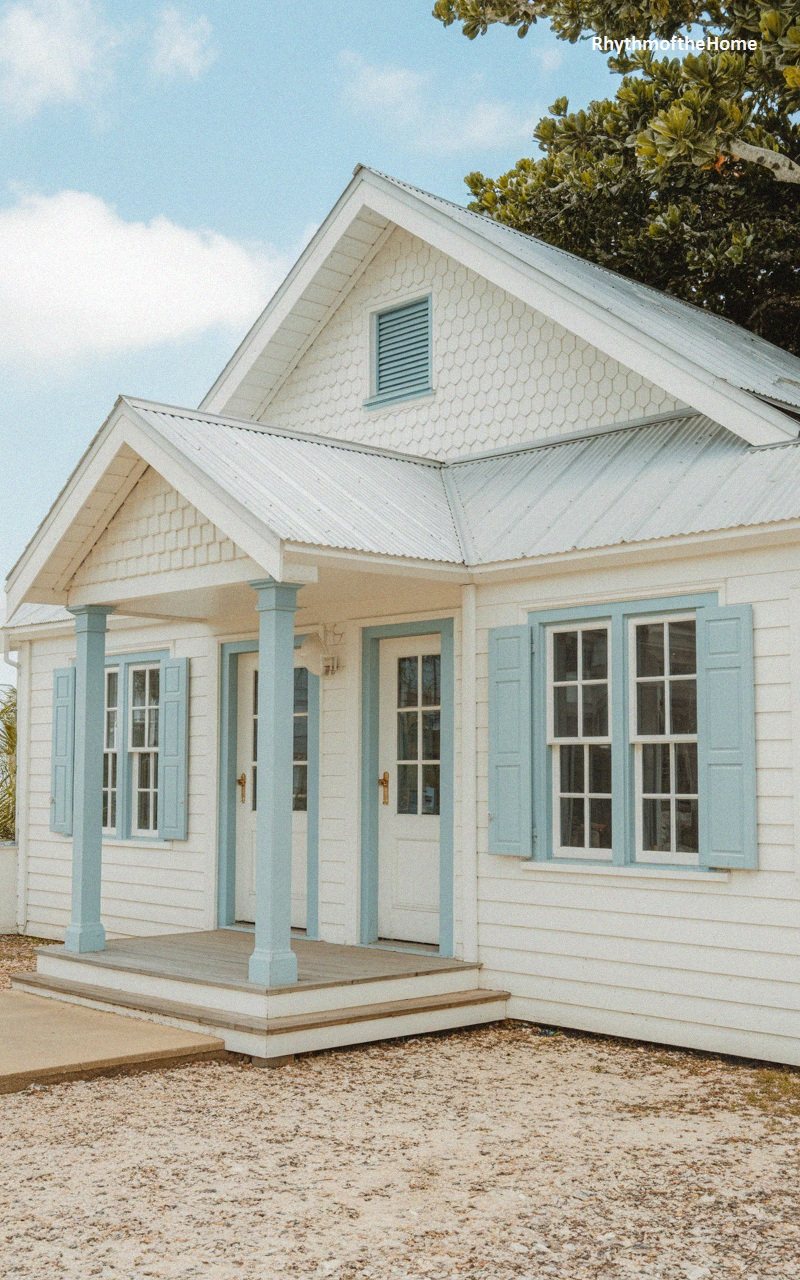 Whimsical details define this beach-inspired dwelling. The gable peak is adorned with decorative scalloped shingles, adding texture and a playful touch above the main roofline. The rest of the home features clean white horizontal siding, contrasted by cheerful sky-blue accents on the square porch columns and window shutters. A corrugated metal roof protects the structure from the elements. The entry porch, though compact, feels substantial due to the thick columns and solid header. Double doors with glass panes welcome visitors, flanking a symmetrical layout that feels breezy, lighthearted, and perfectly suited for a seaside environment.