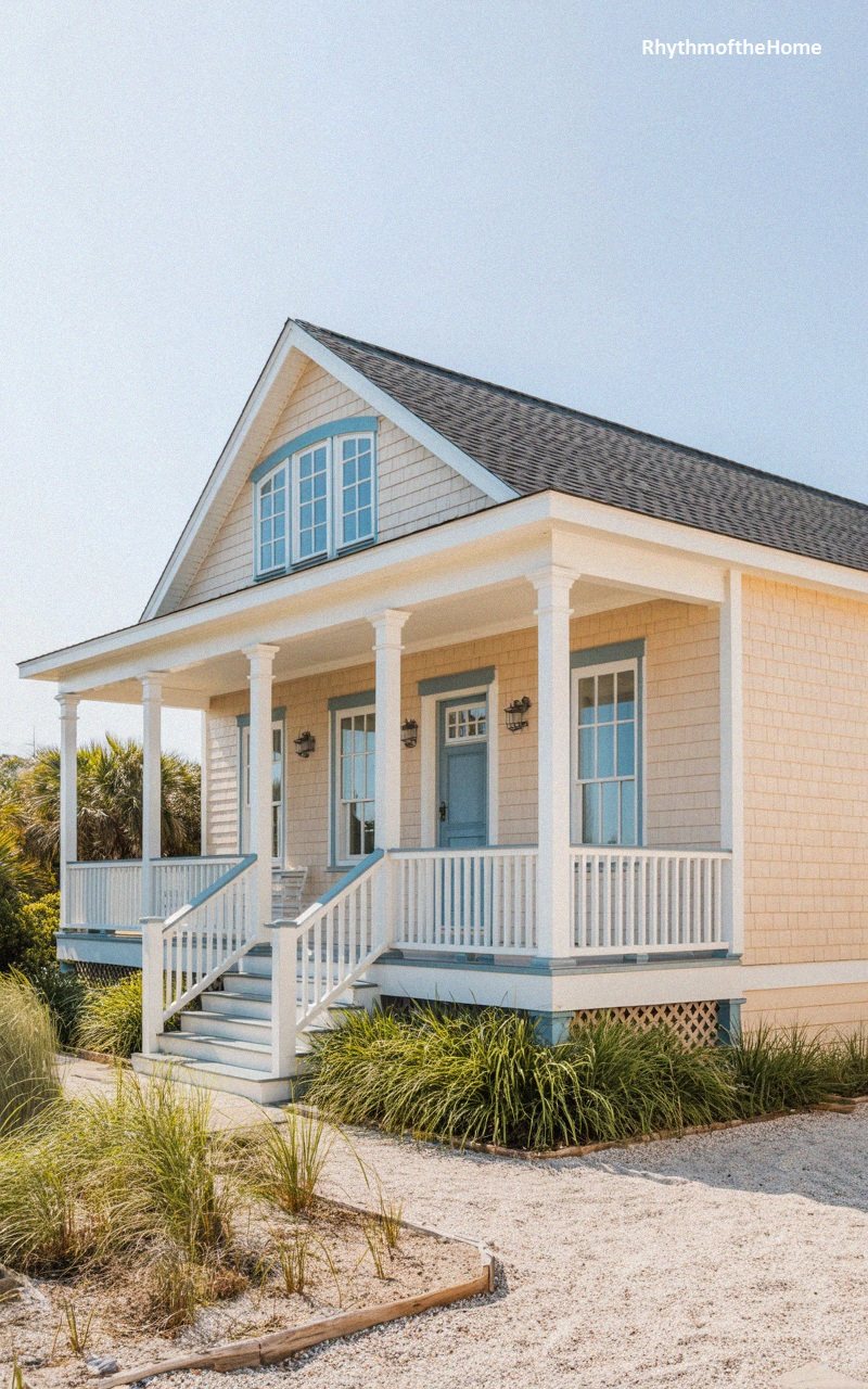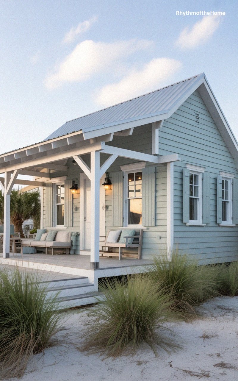 Designed for relaxation, this home features a spacious front porch that functions as an outdoor living room, complete with cushioned sofas and throw pillows. The exterior is painted a soothing robin’s egg blue, complemented by white trim and functional louvered shutters. Exposed rafter tails under the eaves add a hint of Craftsman craftsmanship. The porch floor is finished in a cool grey decking, leading down to a sandy yard filled with dune grasses, reinforcing the beachfront vibe. Lantern-style sconces mounted on the columns provide warm ambiance, inviting residents to linger outside well into the evening.
