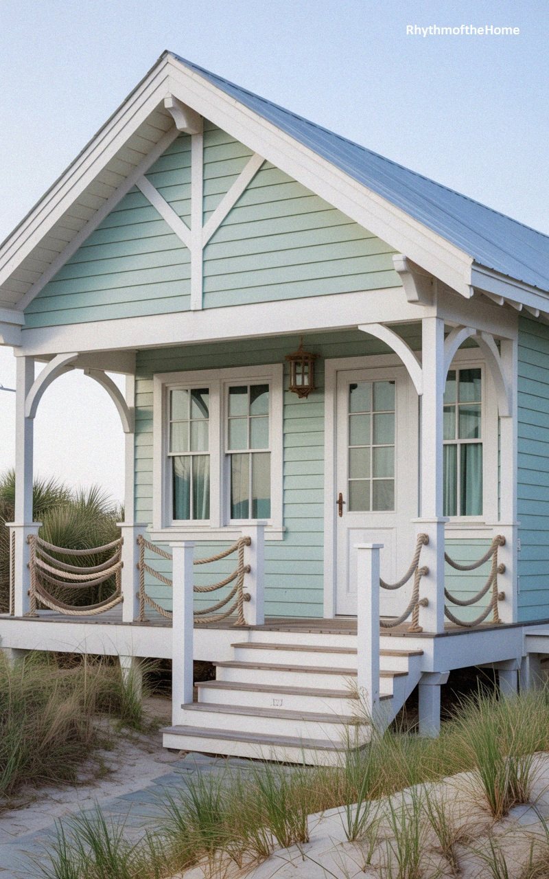 Nautical flair takes center stage in this charming mint-green cottage. The most striking feature is the porch railing, which utilizes thick natural ropes draped between white posts, evoking the feel of a ship’s deck or a pier. The gable end features decorative stick-work truss details, adding architectural depth to the white-trimmed facade. Tall windows allow plenty of light into the compact interior. The house is raised slightly on a white foundation, and the sandy path in the foreground, bordered by beach grass, confirms its identity as a relaxed, ocean-side retreat designed for leisure.