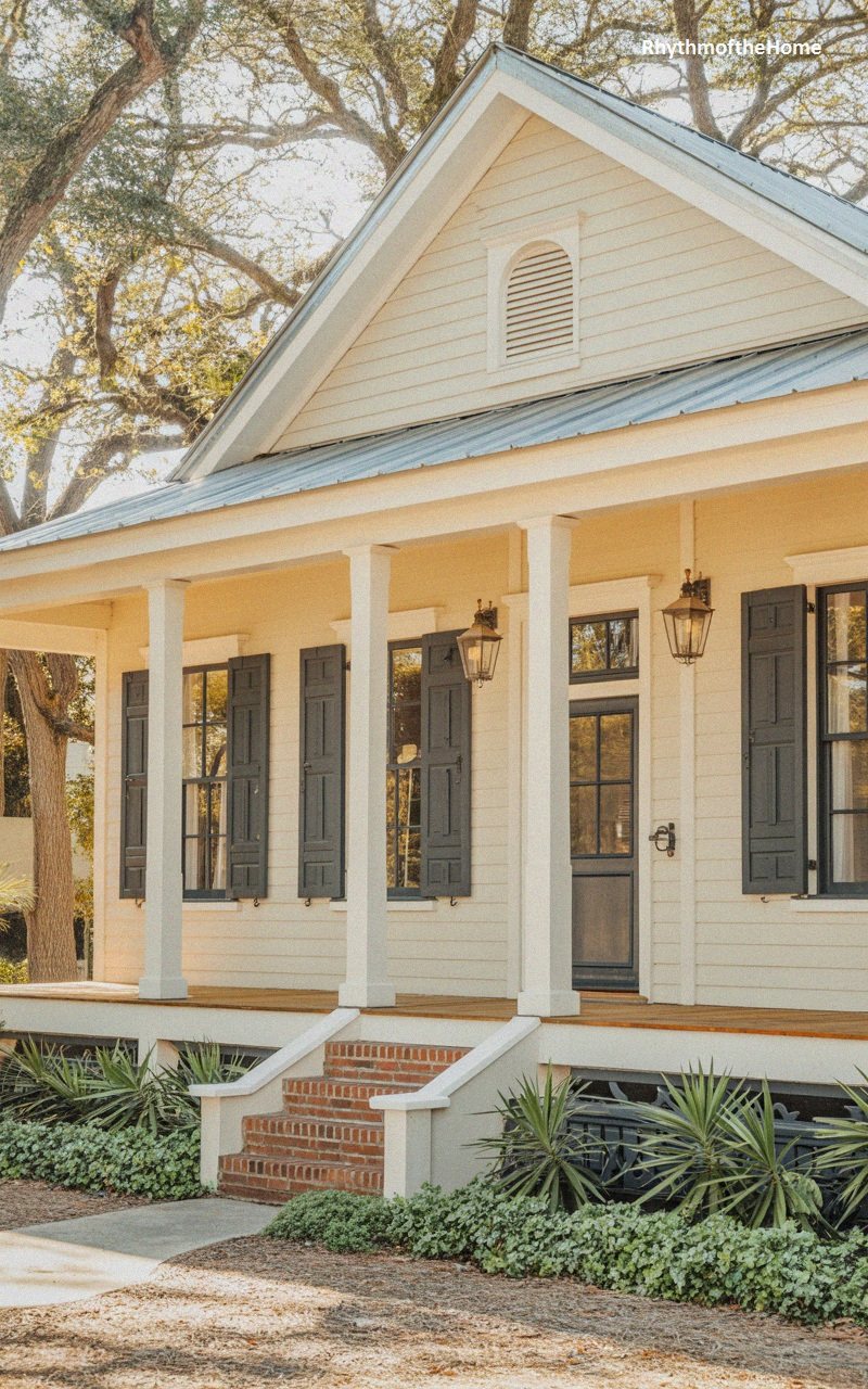 Radiating warmth and cheer, this home is clad in bright yellow siding that contrasts beautifully with the dark charcoal shutters. The deep porch runs the length of the facade, supported by slender white columns that give it a light, airy plantation feel. A metal roof adds a classic Southern touch. The entry is centered, featuring a white door with glass panels and a transom above. Brick steps lead up to the wooden porch floor, and the surrounding garden is filled with low-maintenance greenery, enhancing the home’s friendly and inviting curb appeal.