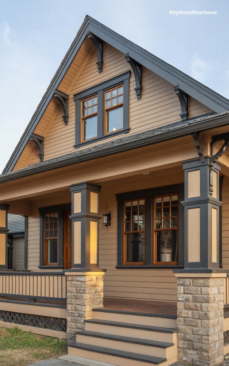 Blending elements of Victorian Gothic and Craftsman styles, this house features a steep gable roof with ornate bargeboards and decorative finials. The siding is a warm, tan color, contrasted by dark charcoal trim that outlines the windows and architectural details. The upper gable window is framed by a dark surround, emphasizing the verticality of the structure. The front porch runs the length of the façade, supported by square columns with detailed capitals and a simple balustrade. The base of the porch columns features light stone, grounding the structure. The entryway is shadowed and private, with a wooden door that hints at a historic interior. The overall effect is one of dramatic elegance, combining intricate carpentry with a cozy, manageable scale.