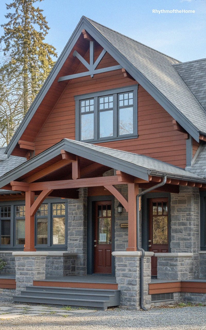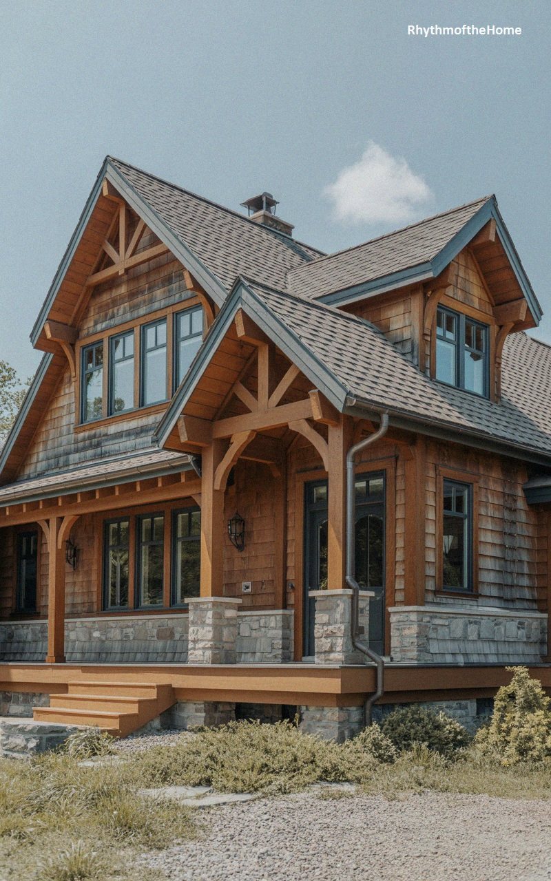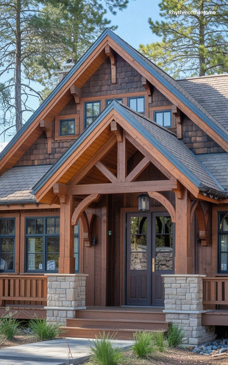Bold and substantial, this home features reddish-brown horizontal siding that makes a strong statement against the grey stone of the porch columns and facade. The heavy timber framing of the entry portico is stained a similar red-brown, creating a cohesive look. The grey architectural shingles on the roof complement the stonework. Double doors with glass panes provide a grand entrance. The landscaping is minimal but neat, with a gravel driveway. This home merges the colorful charm of a cottage with the rugged materials of a mountain lodge.