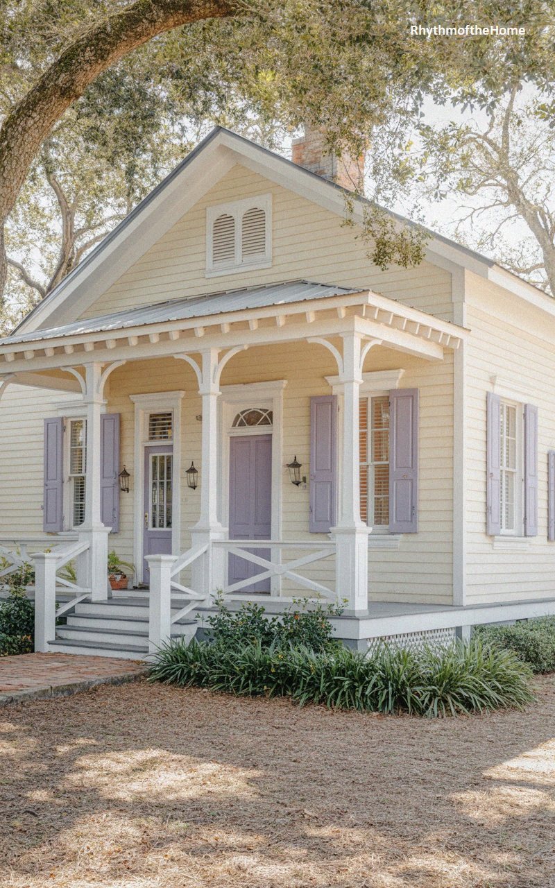 Whimsy and history meet in this charming cream-colored cottage. The standout feature is the use of a soft lavender shade for the front door and the window shutters, adding a unique and playful pop of color. The porch is ornate, with decorative brackets on the columns and a “stick style” railing design. A brick path leads to the white wooden steps. The gable vent is arched, softening the angular lines of the roof. This home feels lovingly preserved, with a distinct personality that sets it apart from more standard color schemes.