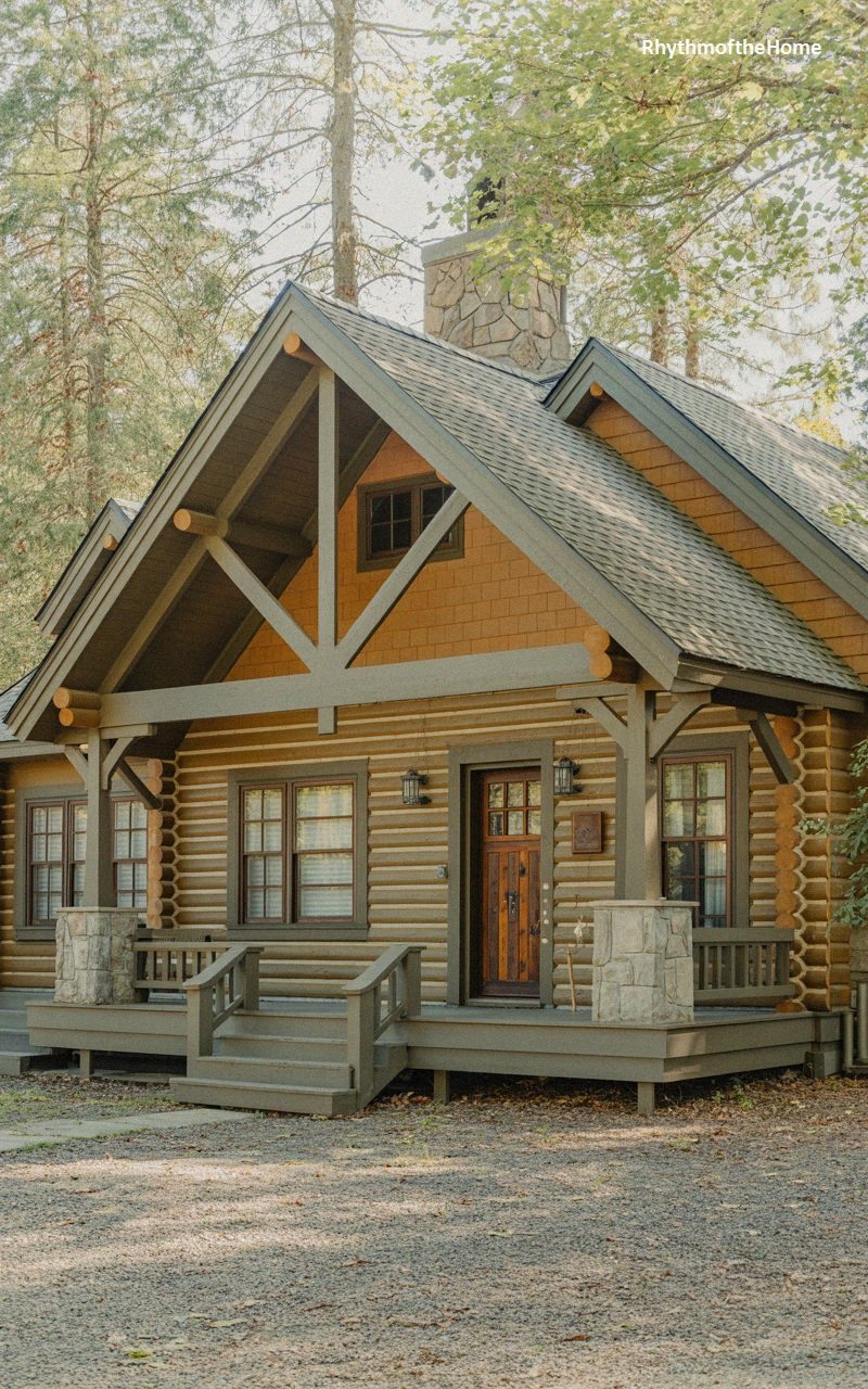 Embracing a rustic aesthetic, this home is constructed with golden-hued logs and matching shake siding in the gables. The design features a complex roofline with steep gables and decorative timber trusses that emphasize the lodge style. Stone pedestals support the dark timber porch columns, grounding the structure to the earth. The windows are framed in a dark bronze or brown, harmonizing with the wood tones. A shingled roof and a small gabled portico over the entrance add to the cozy, mountain-retreat atmosphere. It’s a sturdy, warm home designed to blend with a forest environment.
