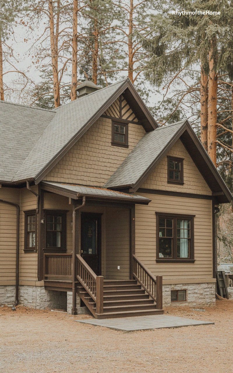 Earthy tones dominate this cozy Craftsman home. The upper story is clad in brown cedar shingles, while the lower level features horizontal siding in a matching hue. Dark brown trim outlines the windows and roofline, creating a unified, monochromatic look. A stone foundation adds texture at the base. The entry porch is modest, with wooden stairs and railing leading to a dark front door with glass panels. A decorative stick-work detail in the gable peak adds a touch of artistry. This home feels grounded and secure, perfectly camouflaged within a wooded environment.