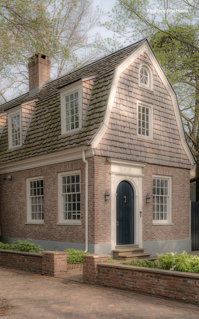 Distinguished by its classic gambrel roof, this home nods to Dutch Colonial influences while maintaining a modern, textural appeal. The roof shingles are dark and mossy, draping over the house like a heavy blanket. The walls are a mix of brick and siding, creating a rich tapestry of materials. A striking arched doorway with a deep blue door invites visitors inside, contrasting with the earthy tones of the masonry. The house is relatively small but feels substantial due to the steep pitch of the roof and the solid brickwork. It sits nestled in greenery, looking like a storybook cottage brought to life.