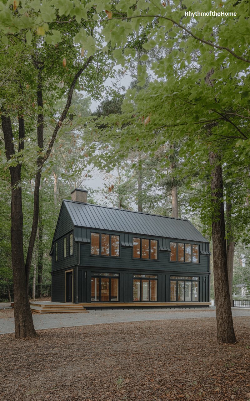 This home makes a bold statement with its dark, charcoal-colored siding and matching metal roof. The monochromatic dark palette allows the structure to recede visually into the surrounding forest, while simultaneously giving it a striking, modern presence. The form is traditional, with a steep gabled roof, but the execution is contemporary. Large windows reflect the trees, blurring the boundary between inside and out. A wooden deck wraps around the base, providing a warm, natural contrast to the dark exterior. It is a stylish, secluded hideaway.
