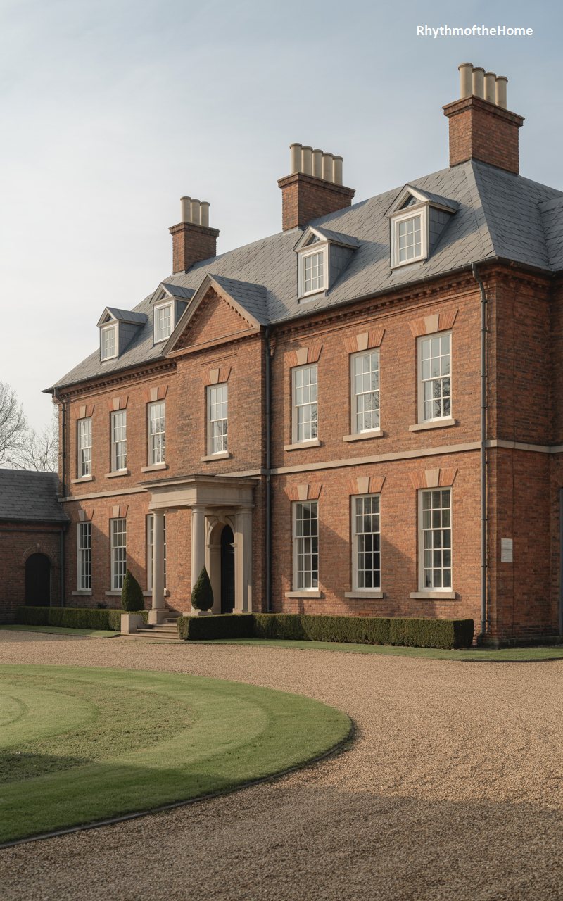 This expansive red brick mansion is the epitome of Georgian symmetry and power. The façade is wide and imposing, characterized by a central projection topped with a pediment. White stone keystones above the windows add a decorative rhythm to the red brick expanse. Three dormer windows peek out from the grey slate roof, balancing the heavy masonry below. A gravel driveway sweeps across the foreground, curving around a meticulously kept lawn. The architecture speaks of wealth and tradition, with every line and proportion calculated to convey a sense of stability, history, and aristocratic elegance.
